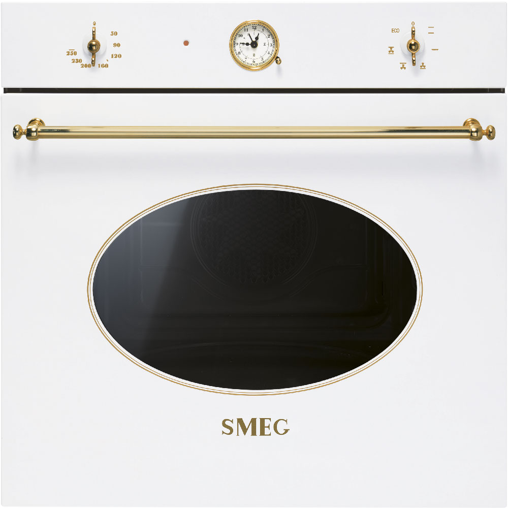 Если вы оформили кухню в классическом стиле, вам отлично подойдет этот электрический многофункциональный духовой шкаф из серии Coloniale. На фоне белого корпуса эффектно смотрится позолоченная фурнитура и стилизованные под старину элементы управления – поворотные регуляторы и механический таймер.