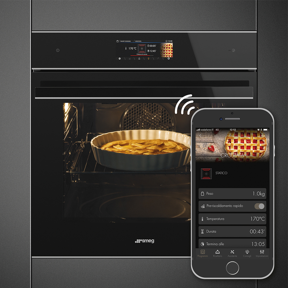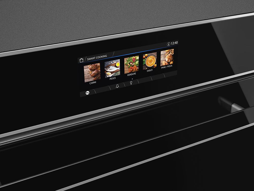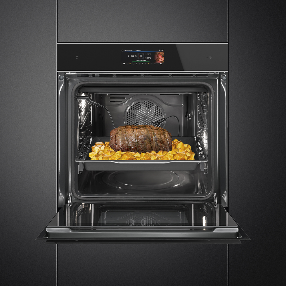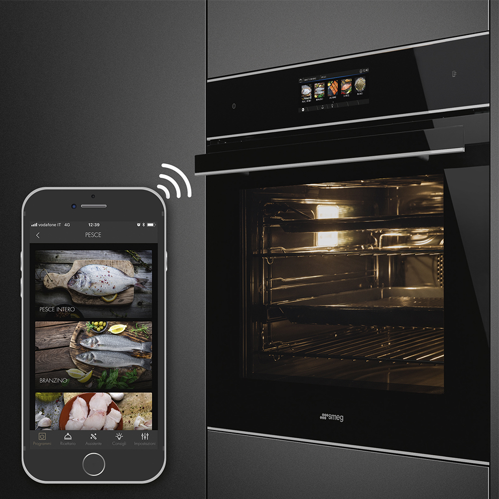 За управление программами и режимами работы отвечает электронный модуль управления Smart Cooking System, оснащенный цветным сенсорным дисплеем. Всего пользователь может активировать 10 режимов работы и 48 автоматических рецептов, которые позволяют готовить популярные блюда различных кухонь мира. Уникальная технология Smeg Connect позволяет управлять шкафом при помощи смартфона, подключенного к сети Интернет.