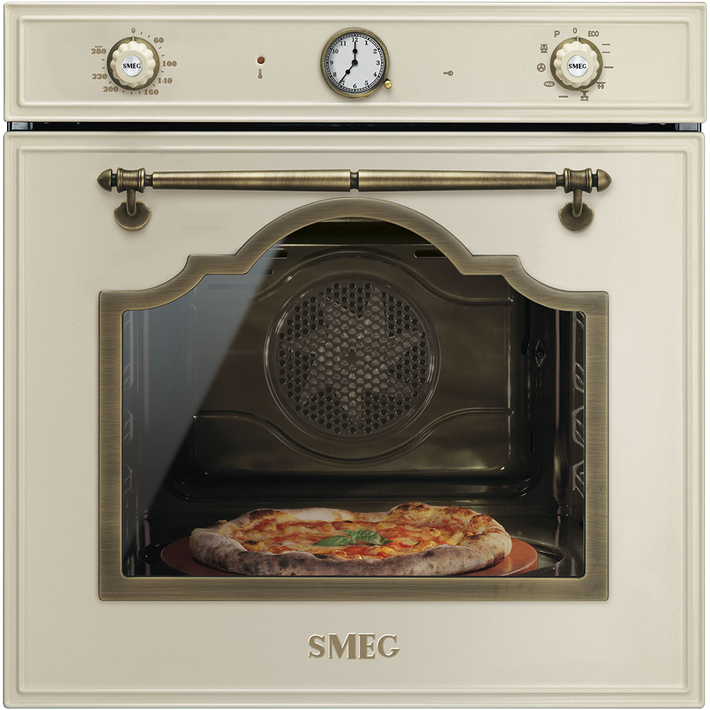 Кремовый духовой шкаф с латунной фурнитурой и выразительным циферблатом посередине панели управления способен украсить любую кухню. 60-сантиметровая модель поддерживает температуру от 50 до 280 градусов, что делает возможной очистку при помощи пиролиза. Несмотря на оформление в стиле ретро, у духового шкафа есть немало полезных функций, в том числе — автоотключение, отсрочка включения, режим Пицца. Очень полезна функция разогрева, благодаря которой вам не придется ждать, пока 65-литровая камера полностью прогреется.