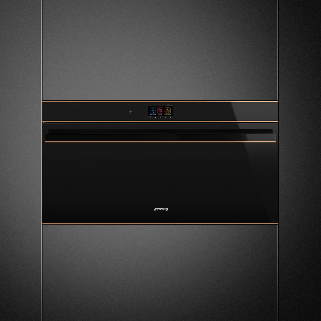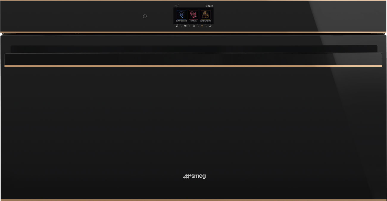 Встраиваемый духовой шкаф из премиальной коллекции бытовой техники SMEG Dolce Stil Novo изготавливается из качественных материалов, среди которых закаленное стекло Eclipse. В качестве фурнитуры используются медные полоски. Модель имеет ширину 90 см, что позволяет устанавливать ее в просторные кухни. Благодаря таким габаритам внутренняя камера устройства имеет объем в 85 литров, чего достаточно для приготовления крупногабаритных блюд. Камера покрыта специальной эмалью Ever Clean, которая заметно упрощает проведение уборки. Также пользователь может применять цикл пиролитической очистки внутренней камеры, во время которой загрязнения удаляются при помощи высокой температуры.