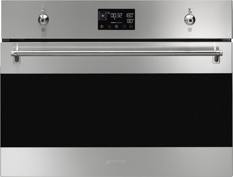 Премиальная модель электрического духового шкафа имеет встраиваемый форм-фактор и может устанавливаться в кухонную мебель. Ширина шкафа составляет 59,8 см, а его высота - 45,8 см. Благодаря компактным габаритам пользователь может установить его в небольшую кухню. Устройство имеет встроенный парогенератор, который позволяет применять технику в качестве пароварки. Стильный внешний вид дает возможность установки духового шкафа в самые разнообразные интерьеры. Модель из коллекции SMEG Classica оснащается фасадом из закаленного стекла Eclipse и матовой нержавеющей стали с обработкой против отпечатков пальцев.