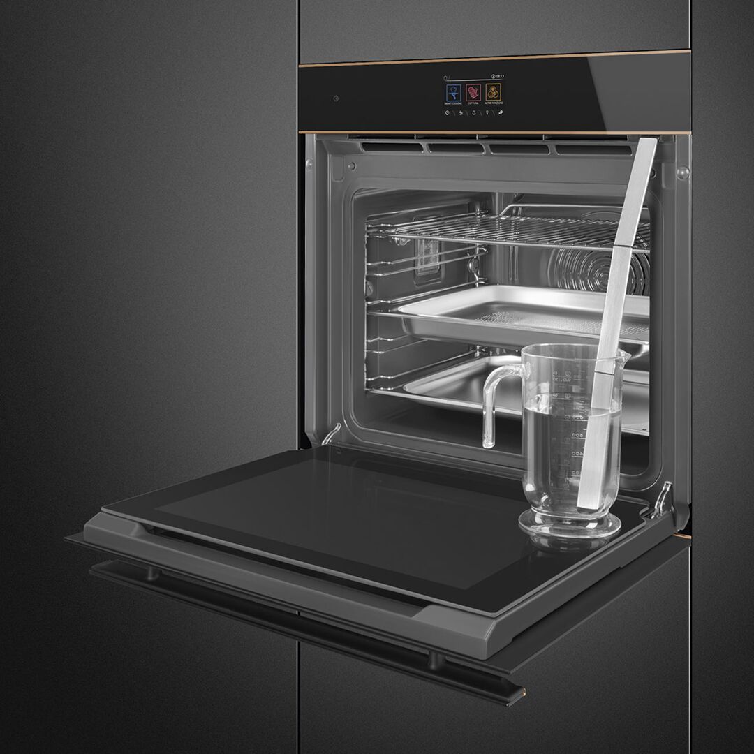 Многофункциональный духовой шкаф оснащен обновленным сенсорным управлением с TFT-дисплеем и электронной регулировкой температуры (от 30 до 250 градусов). Поддерживается 20 режимов работы, в том числе с использованием пара (3 уровня подачи). 150 автоматических программ облегчают приготовление ресторанных блюд в домашних условиях. Технология подачи пара Steam100 PRO дает возможность готовить еду в вакууме по методике Sous-vide. Есть гриль, конвекция, функции размораживания продуктов, поднятия теста, отложенный старт и много других опций. Доступно 10 персональных рецептов и пошаговое приготовление.