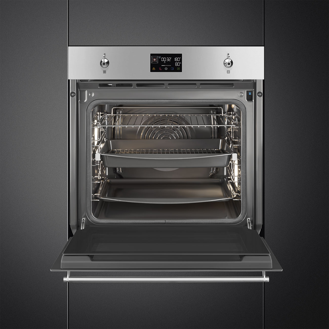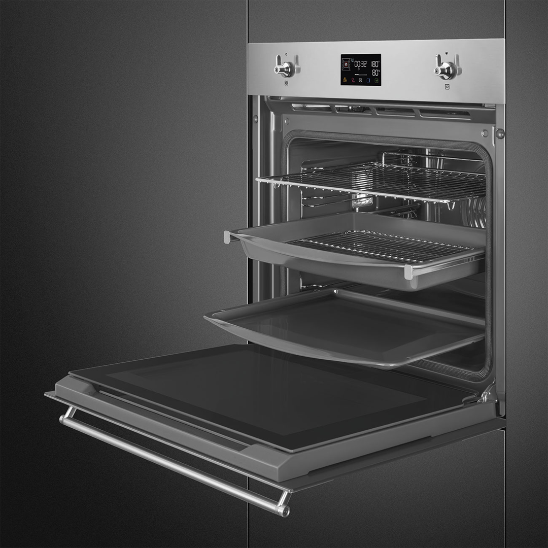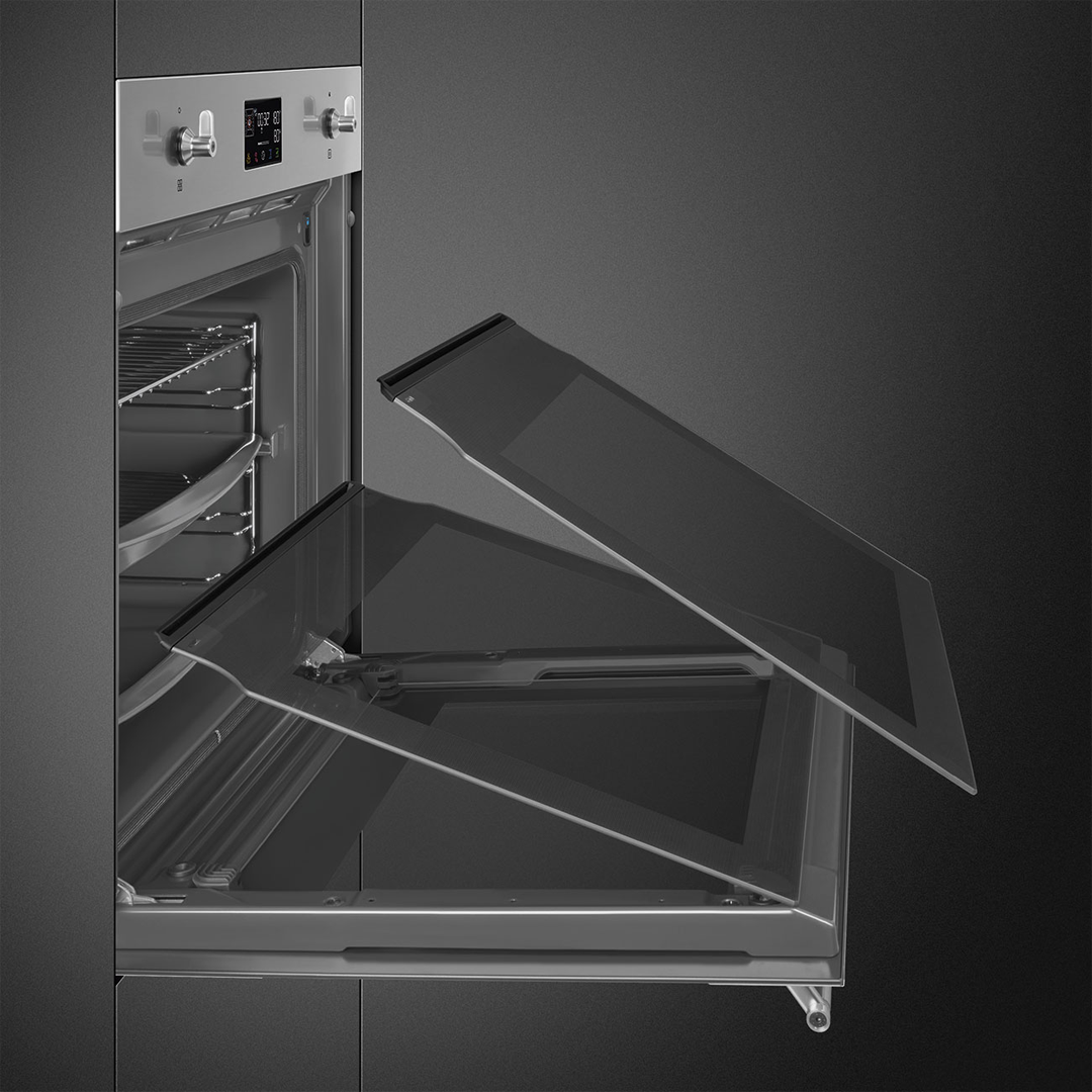 Премиальный духовой шкаф изготавливается из высококлассной нержавеющей стали, которая выдерживает высокую температуру и имеет специальное покрытие, которое защищает технику от появления отпечатков пальцев. Стоит отметить, что модель также оснащается дверцей из тонированного закаленного стекла Eclipse. Она изготовлена по технологии "Холодный фронт" и оснащена 4 защитными стеклами. Модель из дизайнерской коллекции SMEG Classica станет настоящим украшением любого интерьера, в котором используется металлическая бытовая техника.