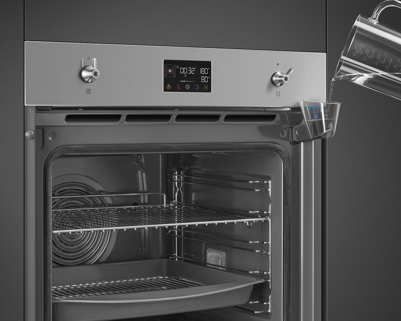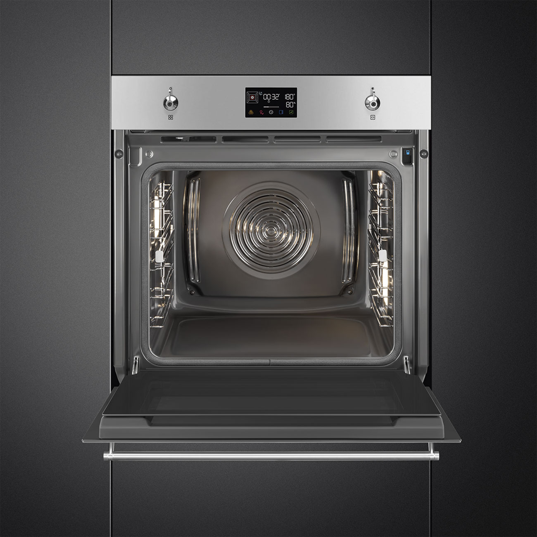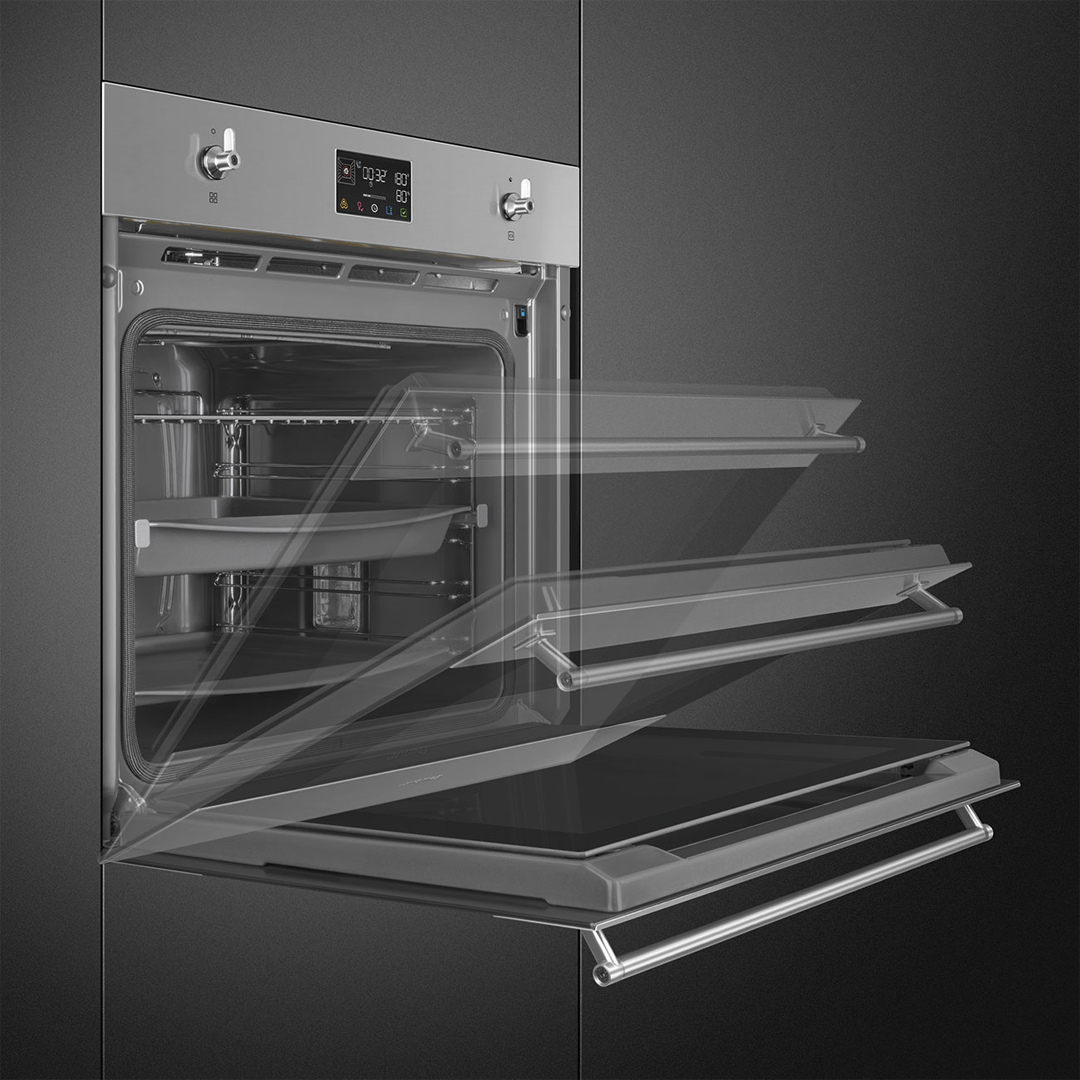 Премиальный духовой шкаф изготавливается из высококлассной нержавеющей стали, которая выдерживает высокую температуру и имеет специальное покрытие, которое защищает технику от появления отпечатков пальцев. Стоит отметить, что модель также оснащается дверцей из тонированного закаленного стекла Eclipse. Она изготовлена по технологии "Холодный фронт" и оснащена 4 защитными стеклами. Модель из дизайнерской коллекции SMEG Classica станет настоящим украшением любого интерьера, в котором используется металлическая бытовая техника.