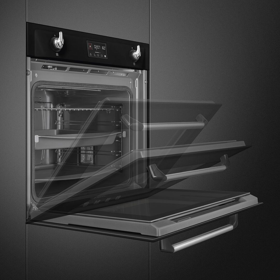 Модель из серии Victoria отличается изысканным дизайном. Корпус духовки черного цвета гармонично сочетается с ручками из нержавеющей стали. Внутренний объем составляет 68 литров, готовить можно на нескольких уровнях одновременно. Телескопические направляющие облегчают загрузку и выгрузку противней. Благодаря независимому подключению шкаф устанавливается и функционирует отдельно от варочной поверхности. Пиролитическая система очистки, тангенциальное охлаждение, многослойное остекление дверцы, защитная блокировка обеспечивают комфортную и безопасную эксплуатацию.