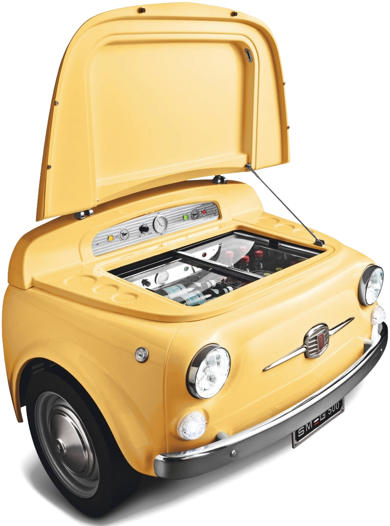Желтый отдельностоящий холодильник из эксклюзивной серии SMEG отличается ярким, запоминающимся дизайном. Однокамерная модель с фирменным логотипом представляет собой точную копию капота известного итальянского автомобиля середины XX века, Fiat 500. Агрегат собирается вручную, при этом используются как оригинальные запчасти кузова автомобиля, так и современные высококачественные материалы. Габариты холодильника (ВxШxГ): 83x125x80 см, общий полезный объем равен 100 л. Современный мотор-компрессор работает тихо и экономично: уровень энергопотребления - А+ (и выше), показатель шума - не выше 42 дБ.