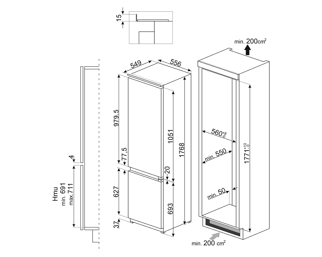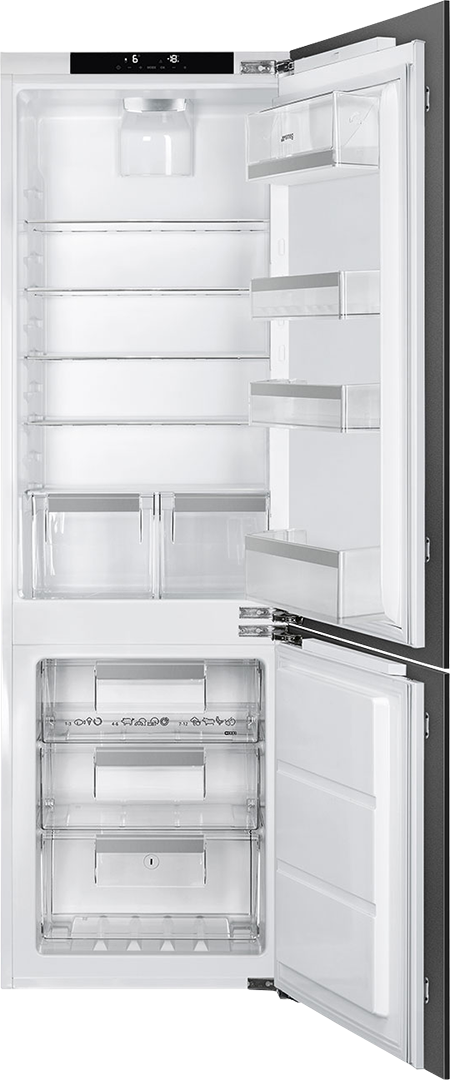 Уникальный холодильник от итальянской торговой марки SMEG имеет встраиваемый форм-фактор и может устанавливаться в кухонную мебель. Модель - двухкамерная, ее габариты составляют 176,9*55,6*54,9 см. Дверца может перевешиваться на любую сторону, она оснащается креплениями для фасадных панелей.