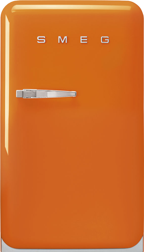 Эта модель ретро-холодильника от компании SMEG имеет высоту 97 см, при этом ширина техники не превышает 54,5 см. Устройство может легко устанавливаться в самые разнообразные интерьеры, как классические, так и современные. Благодаря использованию передовых материалов и качественных комплектующих данная модель отлично справится с любыми поставленными задачами. Устройство выполнено в оранжевом цвете из качественного металла, покрытого термоформируемым полимером. В качестве декоративных элементов используется хромированный металл. Ручка открывается в правую сторону, перевешивание дверцы недоступно. Между дверцей и корпусом располагается антибактериальный уплотнитель.