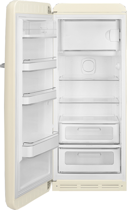 Элегантный кремовый холодильник из дизайнерской коллекции SMEG 50's Retro Style изготавливается из премиальных материалов с использованием самых современных технологических решений. Устройство имеет высоту 150 см, а его ширина не превышает 60,1 см, что позволяет устанавливать технику в мебельные гарнитуры. Стильный дизайн холодильника позволяет украсить любое помещение и делает устройство местом притяжения внимания на кухне. В дополнении к нежному кремовому цвету холодильник украшается хромированными элементами.
