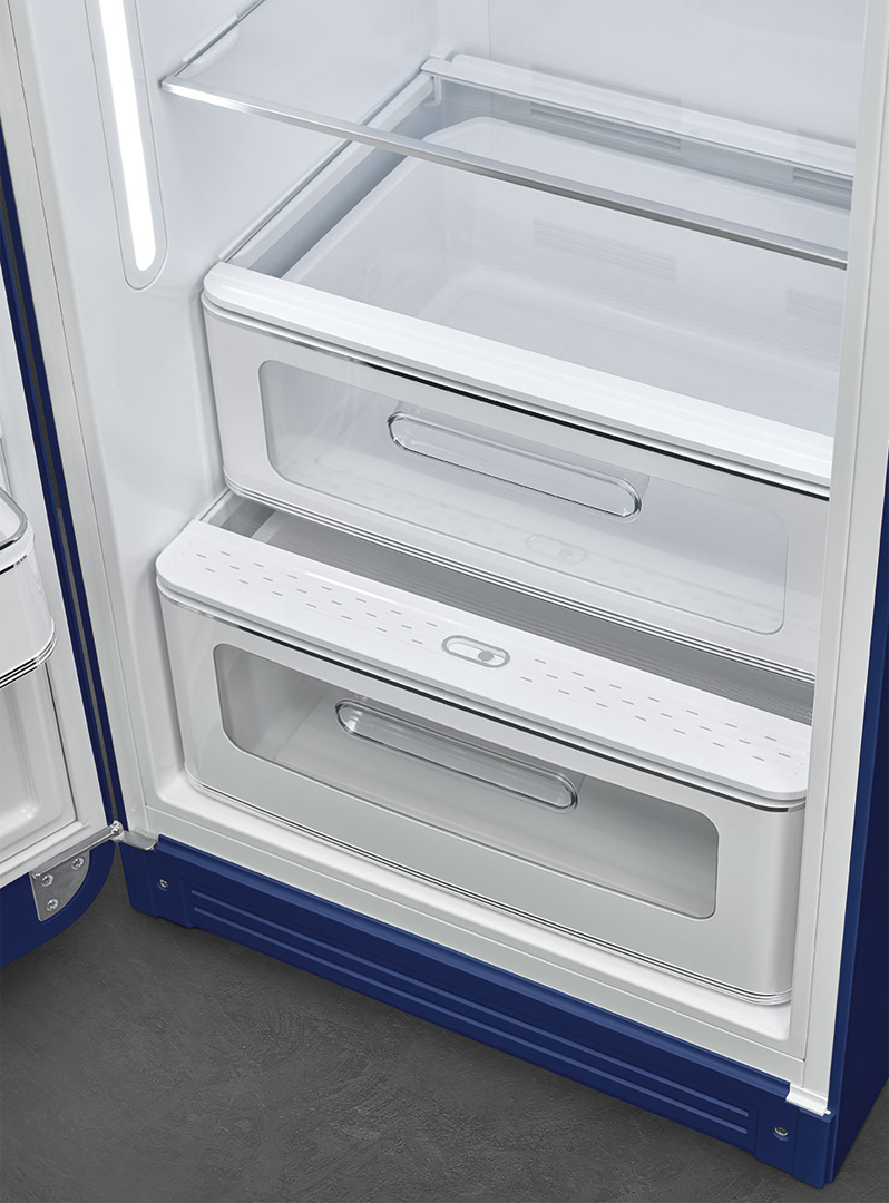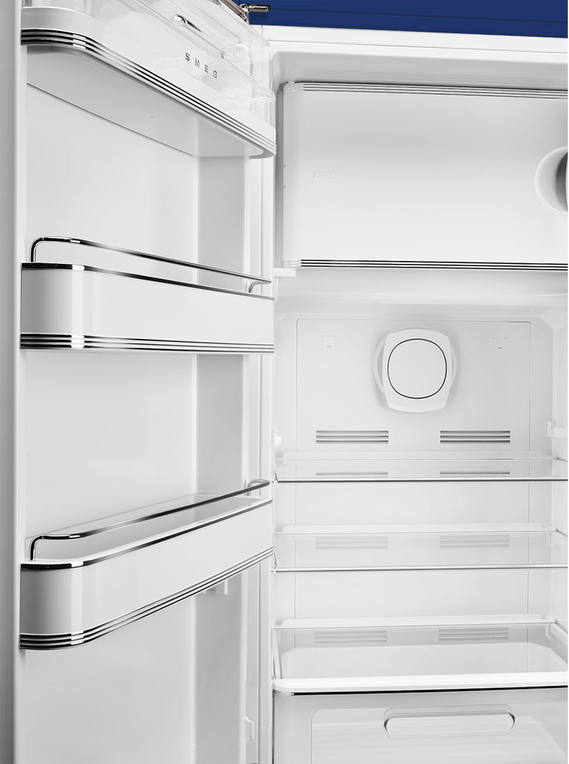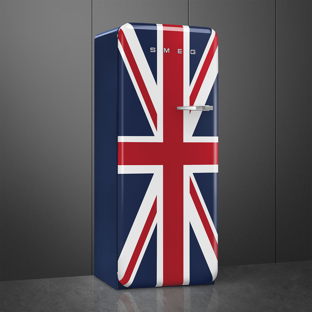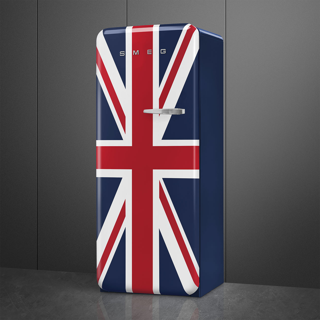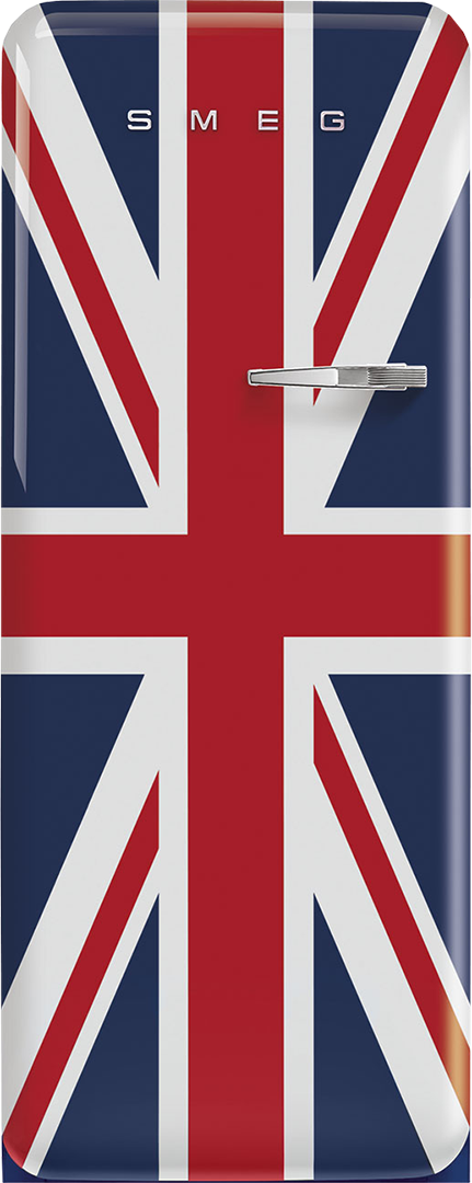 Элегантная модель однокамерного холодильника выполнена в цветах британского флага. Такой холодильник гарантированно будет притягивать к себе взгляды гостей дома. Модель изготовлена в рамках серии "Стиль 50-х годов", которая подходит большинству ретро-интерьеров. Инженеры компании SMEG оснастили классический холодильник множеством современных технологий. Электронный модуль управления работает на основании показаний множества датчиков, в случае проблемы техника привлечет внимание хозяина с помощью звукового или светового сигнала. Владелец может регулировать температуру в камере, а система циркуляции воздуха MultiFlow и светодиодное освещение внутренней камеры включаются автоматически.
