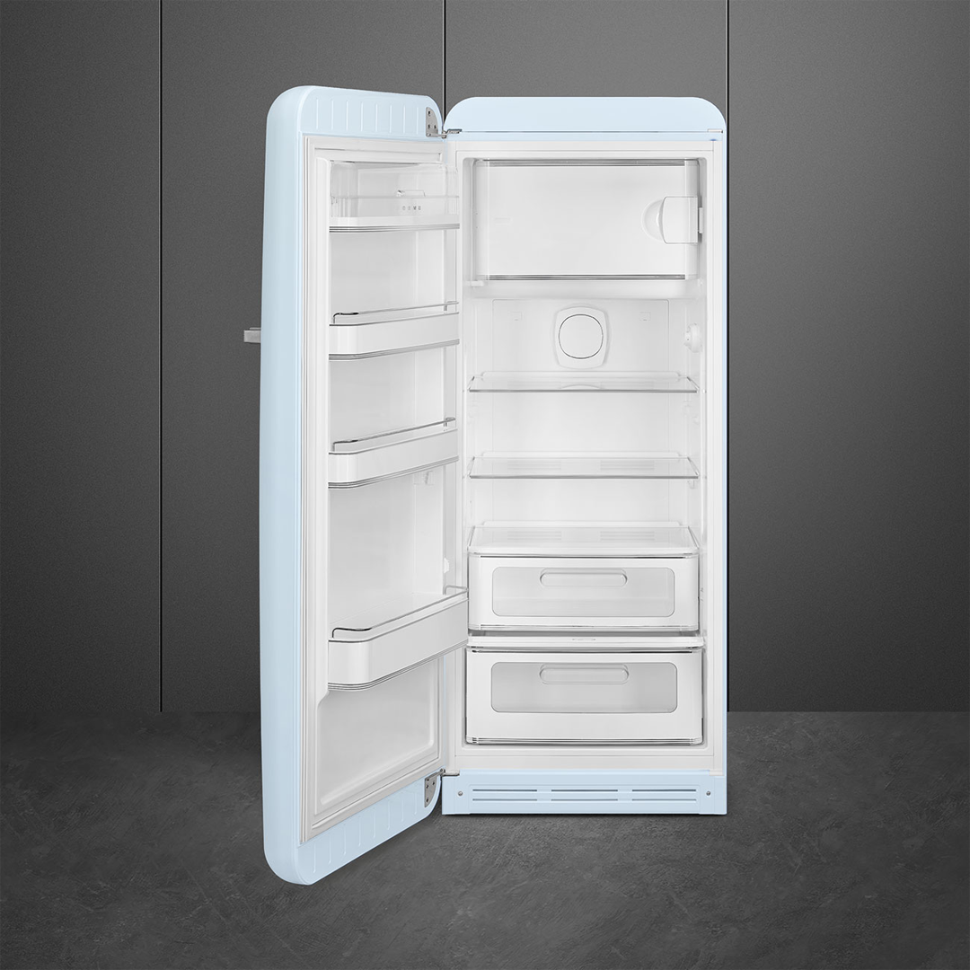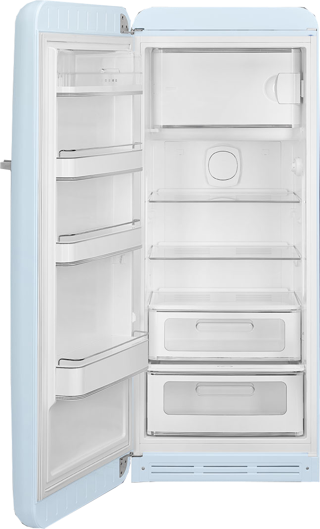 Эксклюзивный однокамерный холодильник из дизайнерской коллекции SMEG 50's Retro Style изготавливается из качественной стали и покрывается термоформируемым полимером пастельно-голубого цвета. Устройство оснащается большим количеством хромированной фурнитуры, которая отсылает пользователя к автомобилям середины прошлого века. Если вы хотите установить современный и технологичный холодильник - то стоит обратить внимание на эту модель, ведь в ней используется инверторный компрессор с низким уровнем шумового загрязнения и минимальным энергопотреблением.