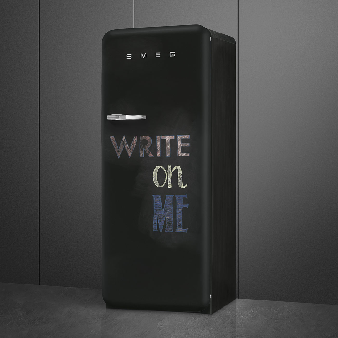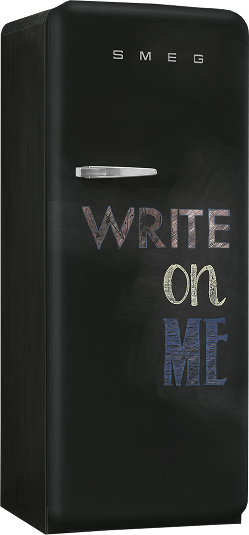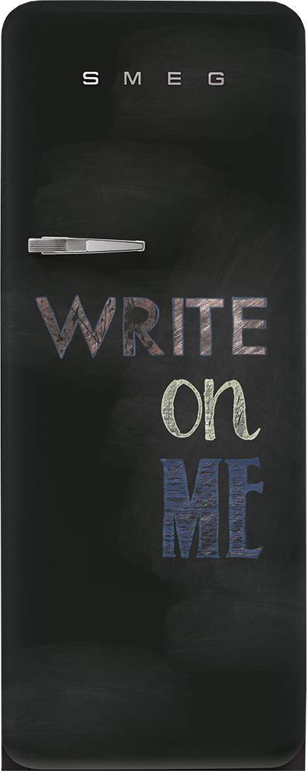 Необычный холодильник от компании SMEG выпущен в рамках коллекции 50's Retro Style, предназначенной для ретро-кухонь. Особенностью данной модели является необычная дверца. Как и другие устройства из коллекции холодильник имеет округлые формы и оснащается хромированной фурнитурой. Стенки и дверца покрываются термоформируемым полимером черного цвета. Данная модель холодильника покрыта полимером, на котором нанесена надпись "Write on me". Таким образом холодильник стилистически походит на графитовую доску, предназначенную для рисования мелками.