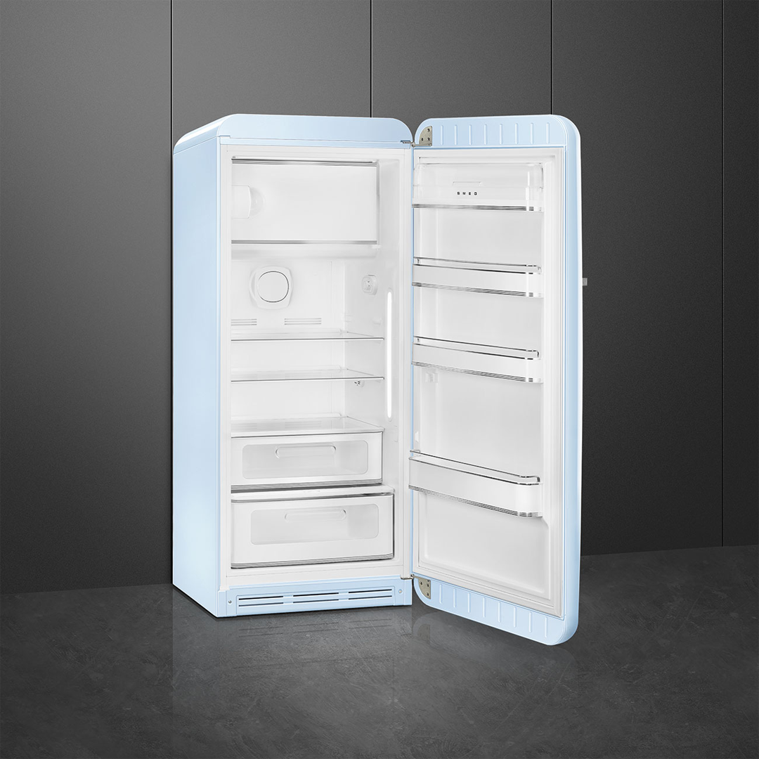 Холодильник объемом 270 литров выпускается в рамках эксклюзивной ретро коллекции Стиль 50-х. Пастельный голубой корпус с глянцевой отделкой и хромированными ручками будет отлично смотреться в классическом интерьере. Дверца с антибактериальным уплотнителем обеспечивает надежную теплоизоляцию, что значительно снижает расход электроэнергии (класс А+++). Инверторный компрессор отличается тихой работой и долговечностью. Высокоэффективная капельная система оттайки позволяет отказаться от технологии No frost. В камерах поддерживаются оптимальные показатели температуры и влажности.