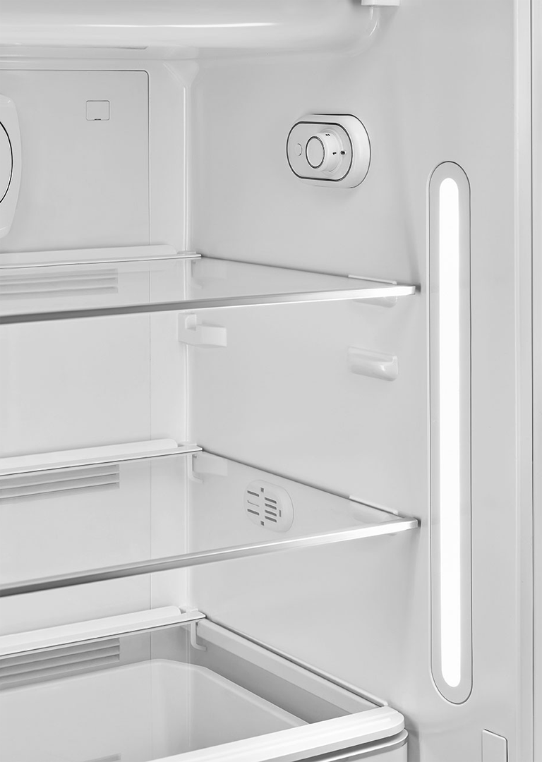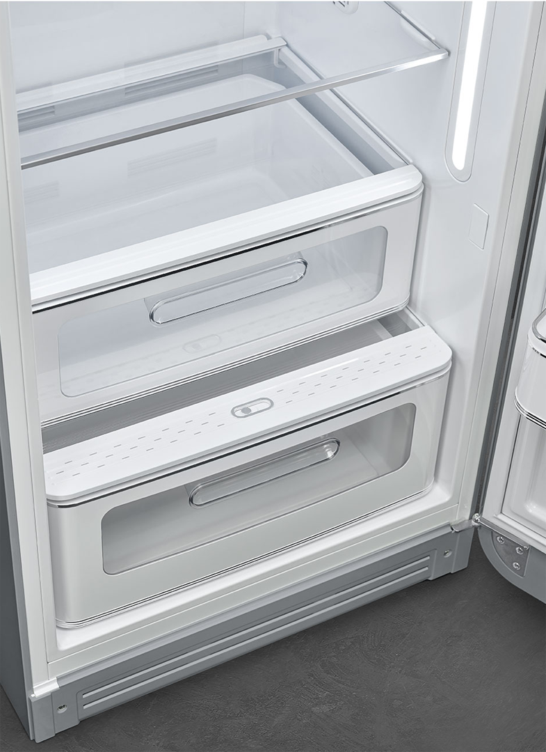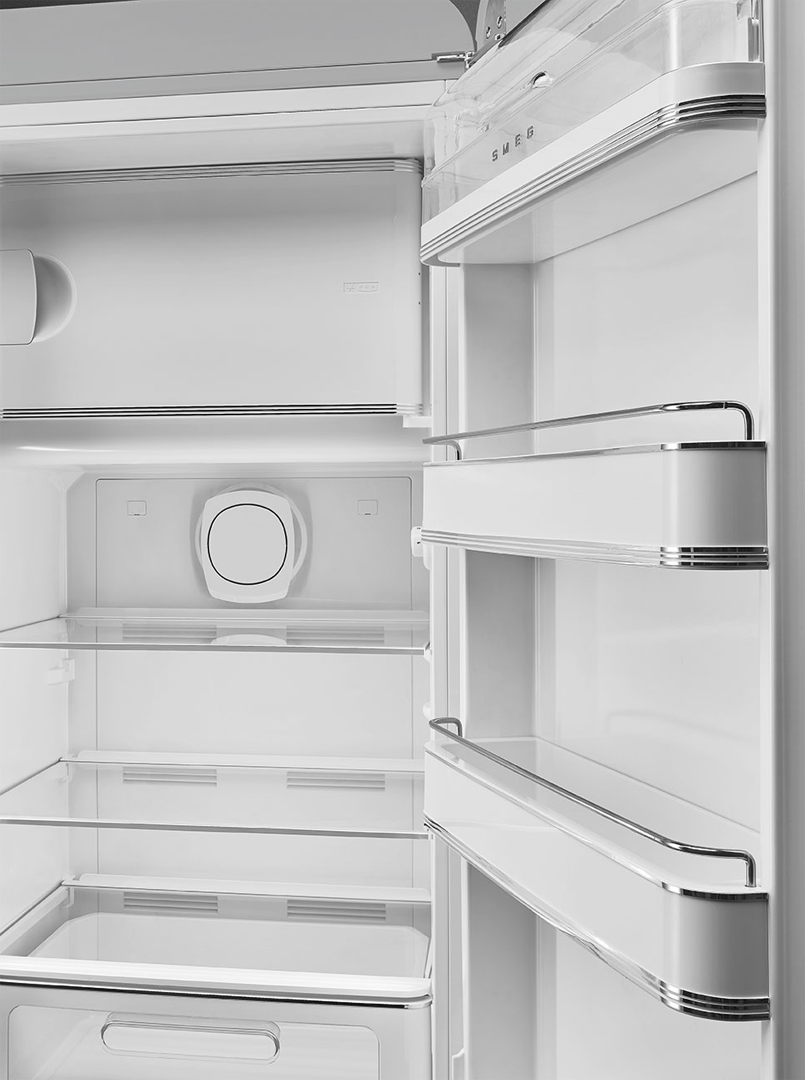 Серебристый холодильник от итальянской компании SMEG имеет отдельностоящий форм-фактор и может устанавливаться в любом месте кухни. Благодаря использованию качественных материалов и долговечных комплектующих устройство имеет увеличенный срок службы. Охлаждение внутренних камер обеспечивается мощным инверторным компрессором, который потребляет минимальное количество электроэнергии (139 кВт в год) и издает минимальное количество шума (всего 38 дБ). Благодаря реализации климатического класса SN, N, ST, T холодильник можно использовать в любом российском регионе.