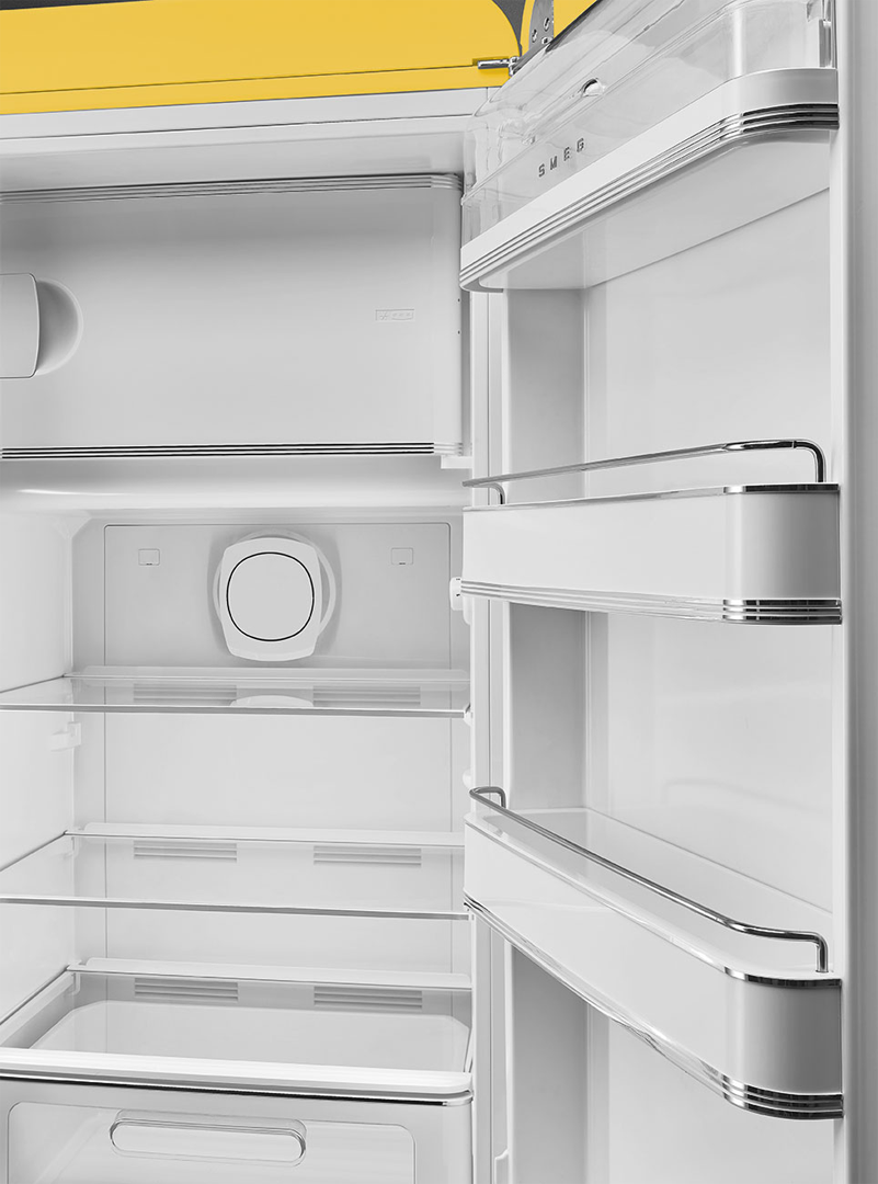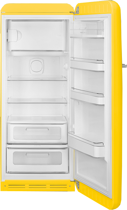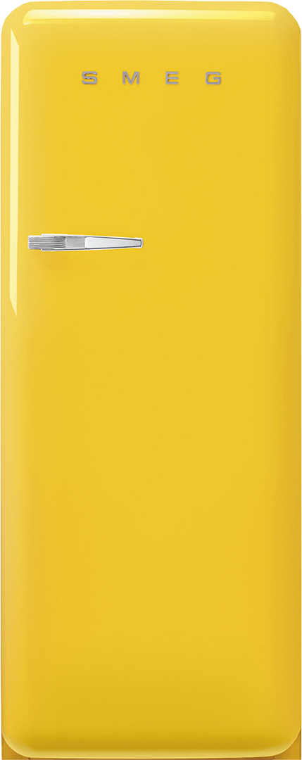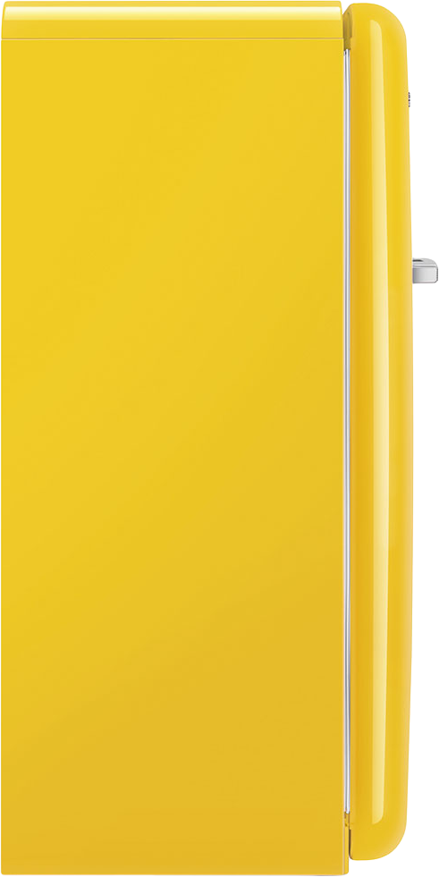 Яркий холодильник SMEG желтого цвета имеет высоту в 150 см, его легко можно установить в любой интерьер. При этом сам холодильник является частью коллекции "Ретро-стиль 50-х годов", в которой представлено множество видов бытовой техники. Желтый холодильник не только станет украшением вашей кухни, но и позволит надежно хранить большое количество продуктов.