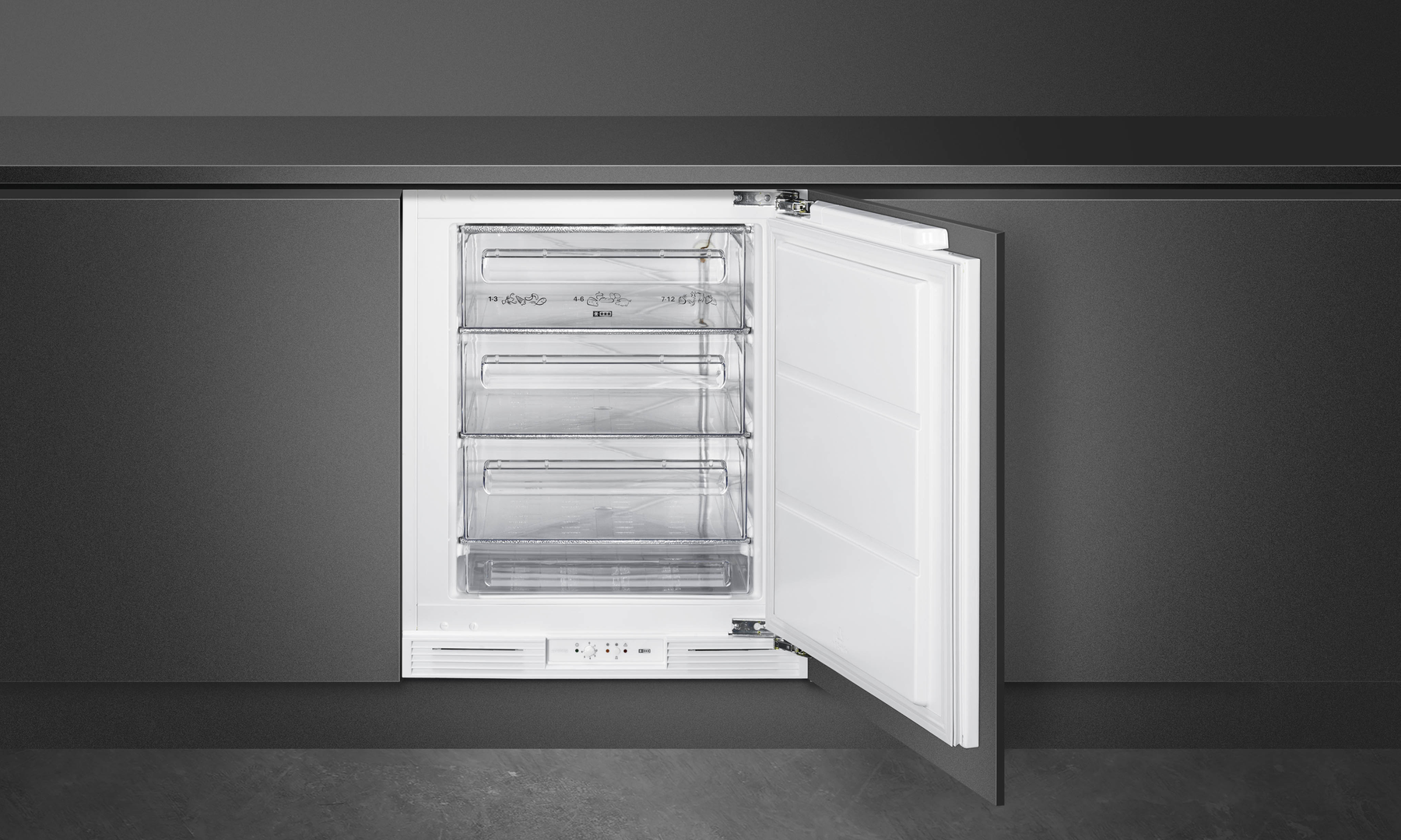 Встраиваемая морозильная камера от компании SMEG имеет компактные габариты и может устанавливаться не только на кухне. Покупатель может разместить небольшой морозильник в офисе, гостиной или кабинете. Многие также приобретают эту модель для дачи. Габариты устройства составляют 59,6*81,9*54,6 см, это позволяет размещать технику в стандартную ячейку корпусной техники шириной 60 см. При таких скромных габаритах инженерам удалось оснастить морозильник большой камерой на 95 литров. Мощность замораживания при этом составляет 7,1 кг в сутки, что значительно больше, чем у многих аналогичных устройств.