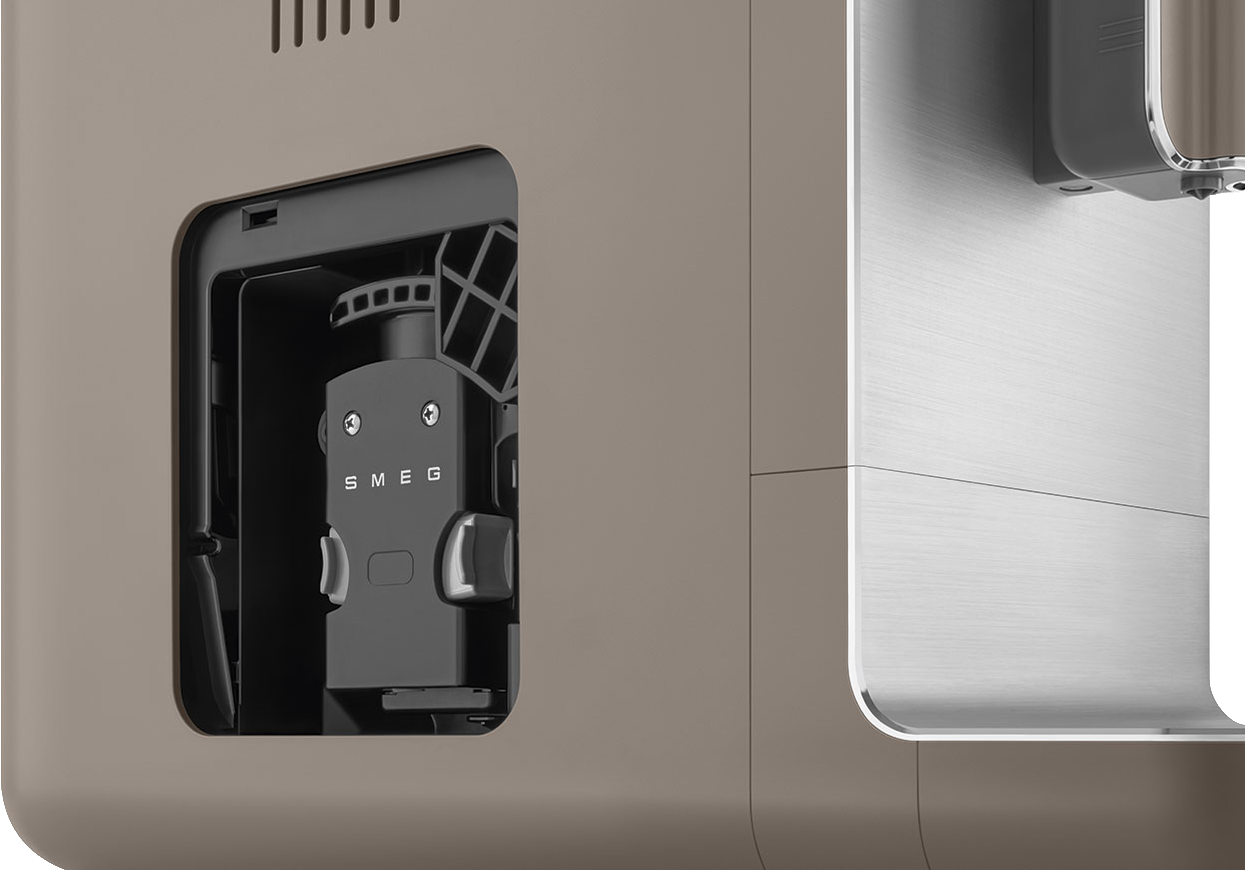 Элегантная кофемашина серо-коричневого цвета Taupe от компании SMEG выпускается в рамках дизайнерской серии 50's Retro Style. Устройство не только обладает множеством полезных функций, но и имеет премиальный внешний вид. Благодаря наличию собственного корпуса с фурнитурой из полированного алюминия данное устройство станет центром притяжения внимания на кухне. Модель имеет небольшие размеры и легко помещается даже на небольшой столешнице. Для приготовления напитков используется термоблок с помпой, который работает при давлении в 19 бар. Пользователь оценит съемный заварочный блок, большую емкость для воды на 1,4 литра, поддон для сбора капель и контейнер для кофейной гущи на 8 порций напитка.