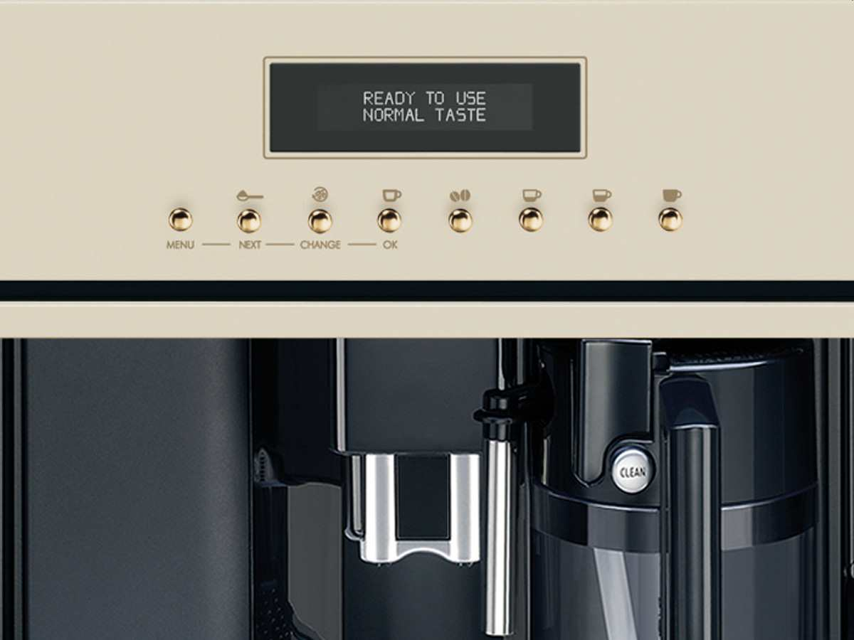 Эта модель автоматической кофемашины представляет собой современное и функциональное решение для приготовления кофе, кофейных напитков или чая. Стилизованная под ретро-стиль, она станет отличным дополнением любого кухонного интерьера, сочетаясь с другой бытовой техникой от Smeg. Большое количество автоматических рецептов позволит быстро приготовить вкусный и ароматный эспрессо, латте или капучино. Для этого может использоваться как зерновой, так и молотый кофе. Кроме того, предусмотрены гибкие возможности в ручной настройке параметров приготовления, включая степень помола, регулировку количества кофе, температуру подогрева воды. Управление осуществляется при помощи двух поворотных переключателей и многоязычного LCD-дисплея, на который выводится вся необходимая информация.