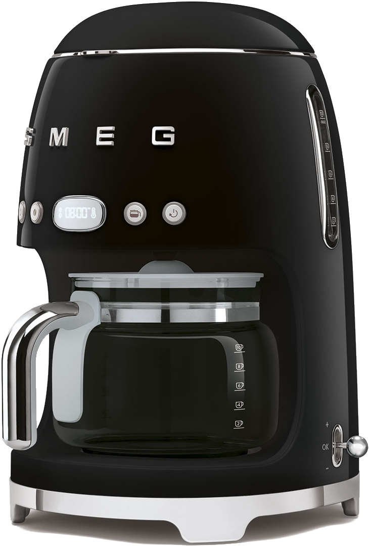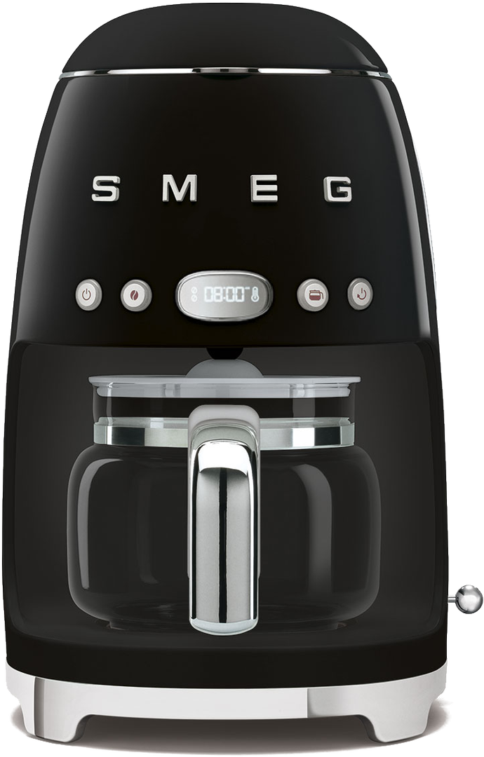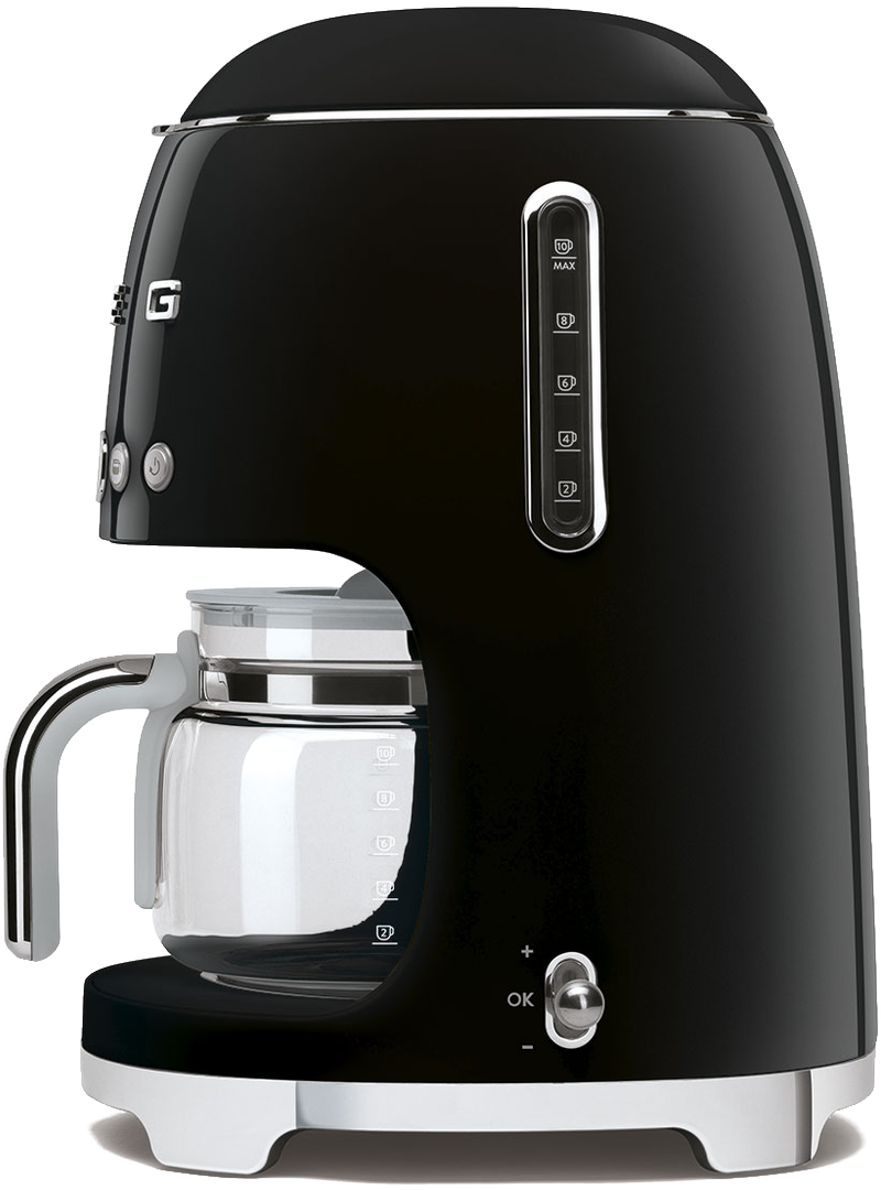 Черная кофемашина в стиле 50-х годов порадует не только приятным дизайном, но и функционалом. Несмотря на ретро-внешность, у модели неплохая мощность — 1050 Вт. Большой стеклянный кувшин для воды на десять чашек (1,4 литра) снабжен индикатором, так что вы легко поймете, когда нужно будет наполнить его снова.