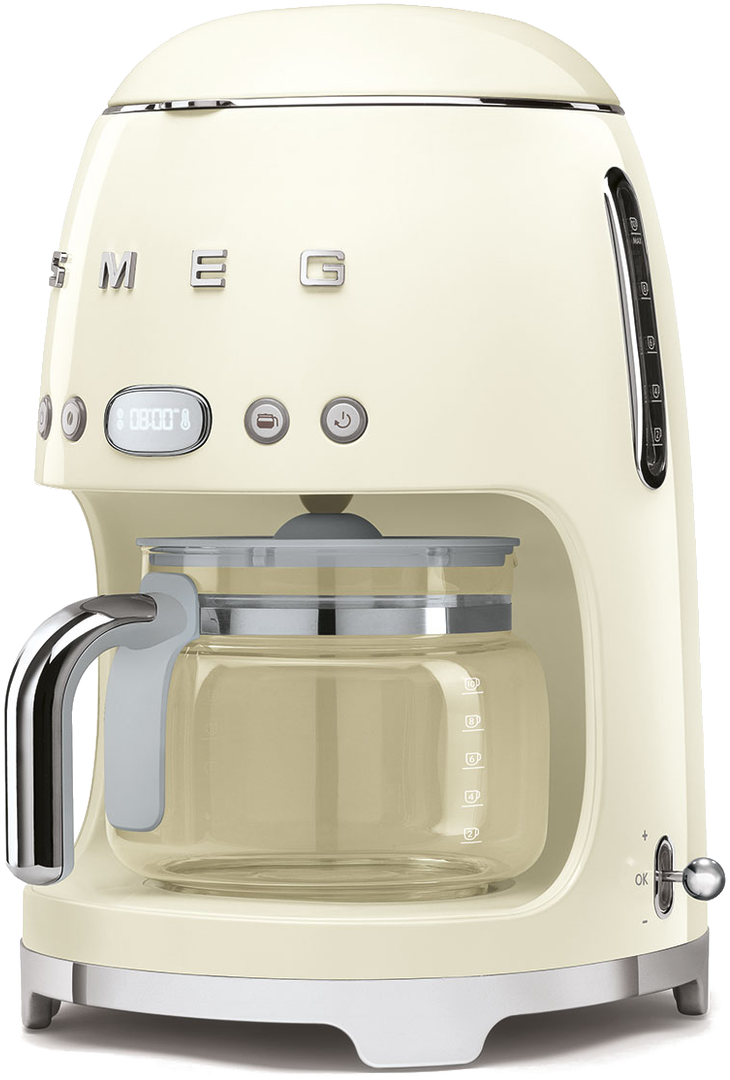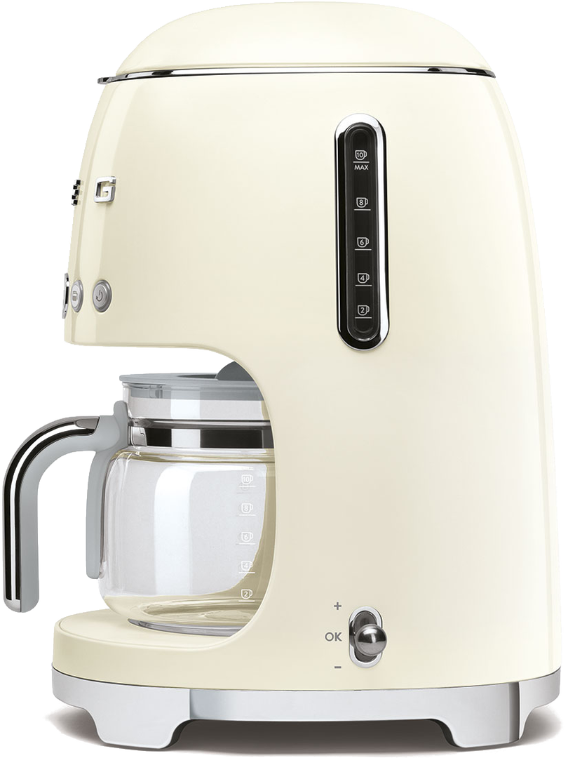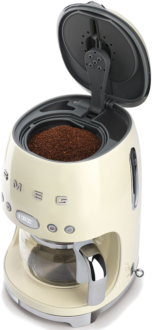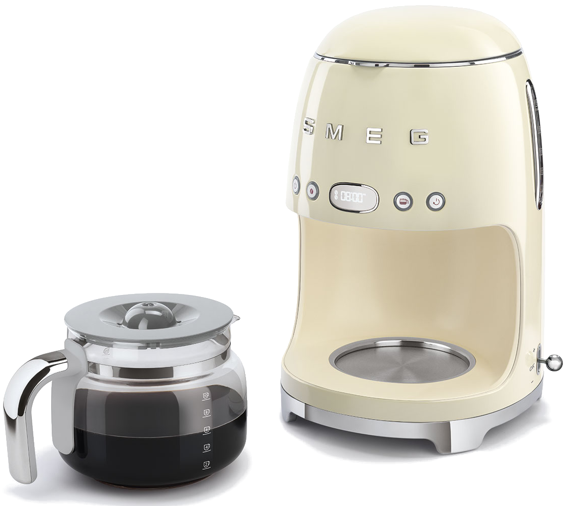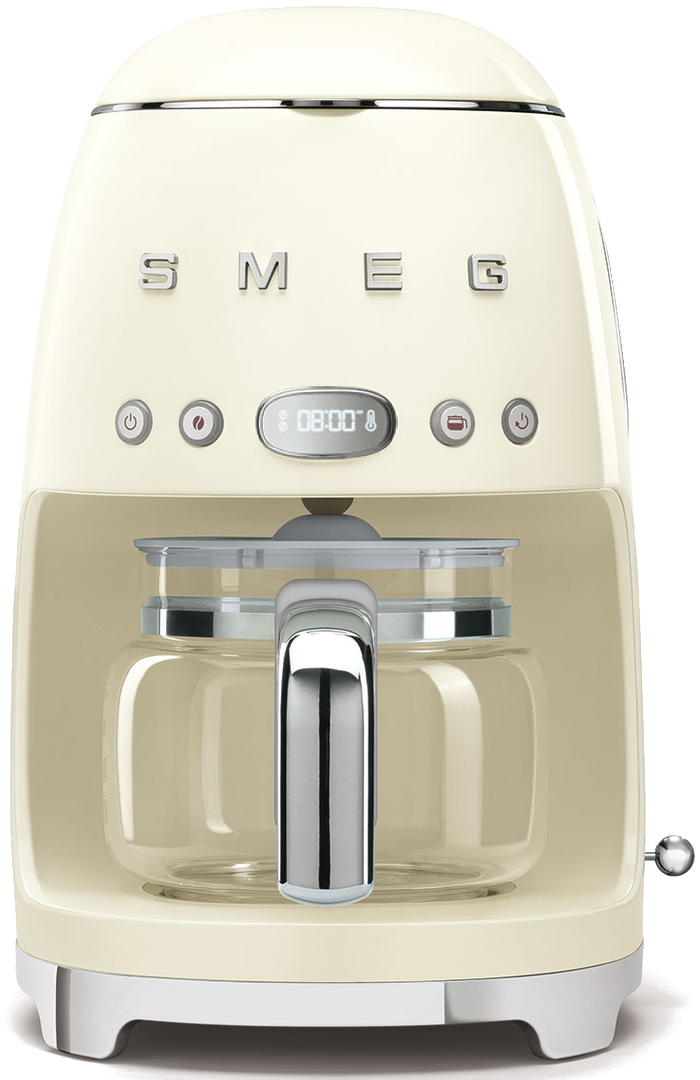 Бело-серебристый корпус в стиле 50-х — находка для любителей ретро-интерьеров, но поклонники бренда Smeg дают модели отличные отзывы не только из-за удачного дизайна. Эта кофемашина укомплектована цифровыми часами и LED-дисплеем. Объем ее стеклянного кувшина — 1400 мл, так что вы можете приготовить за одну заправку до 10 чашек кофе.В комплект входят мерная ложка для молотого кофе и многоразовый фильтр с ручкой, которым очень удобно пользоваться. Нескользящие ножки дают возможность устанавливать кофемашину на любые поверхности — от пластика до полированной нержавеющей стали или искусственного камня.