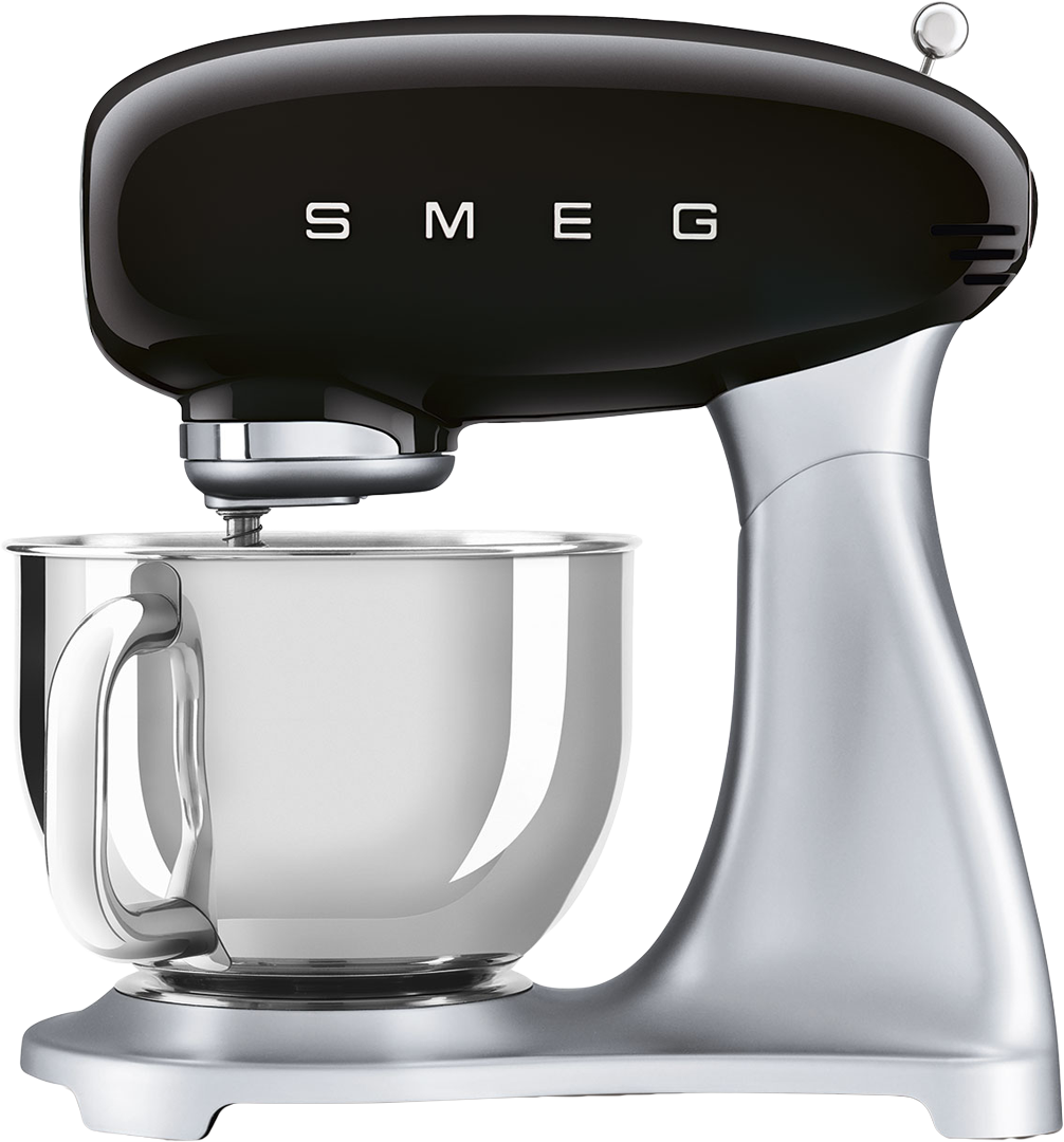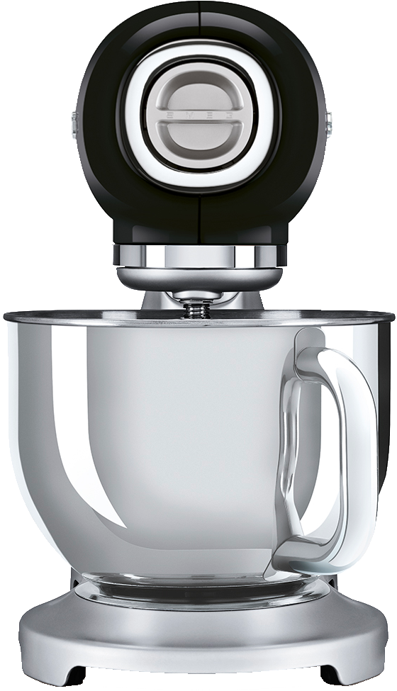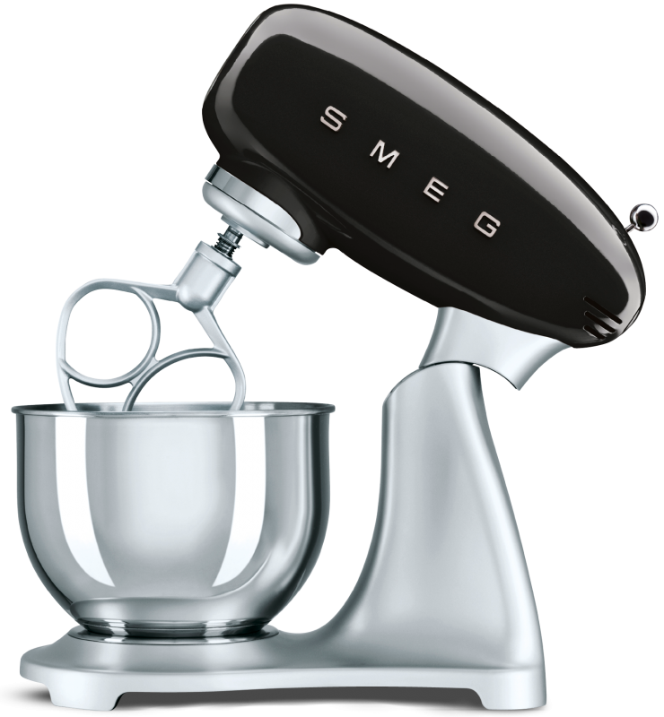 Этот роскошный черно-серебристый планетарный миксер из ретро серии Smeg способен украсить интерьеры в самых разных стилях — скандинавском, классике, прованс или лофт. Отличительная черта модели — универсальность: у нее есть фронтальный порт для дополнительных насадок, а в список входящих в комплект аксессуаров входят венчик, крюк для теста, особая насадка для плотных продуктов из алюминия. Чаша из полированной нержавеющей стали просто огромна — ее объем 4,8 л. Если вы планируете защитить содержимое чаши от высыхания во время паузы в приготовлении пищи, используйте крышку.