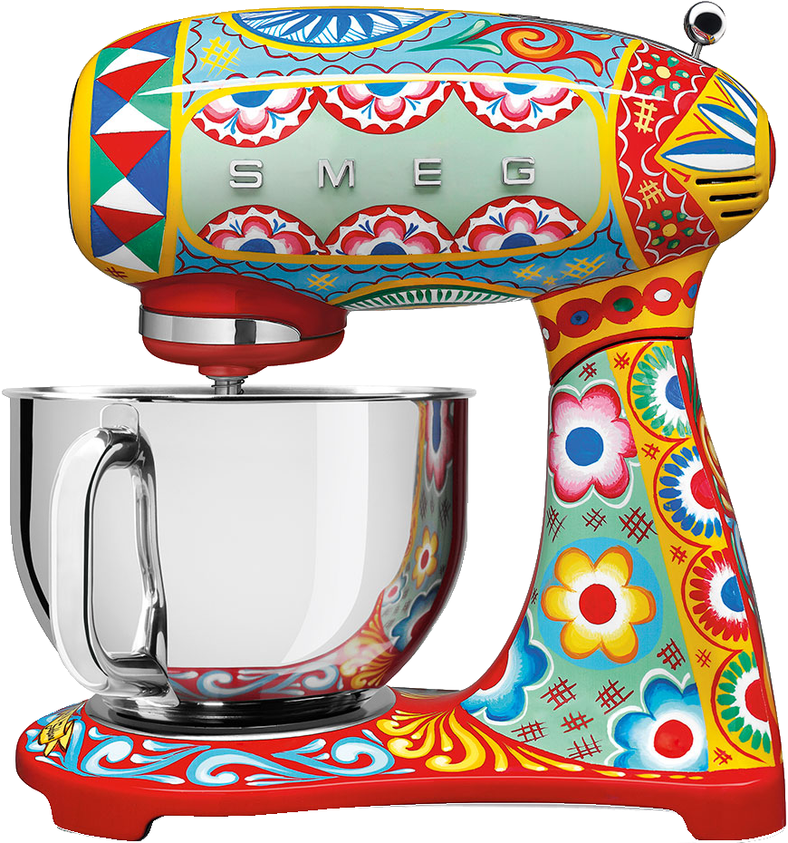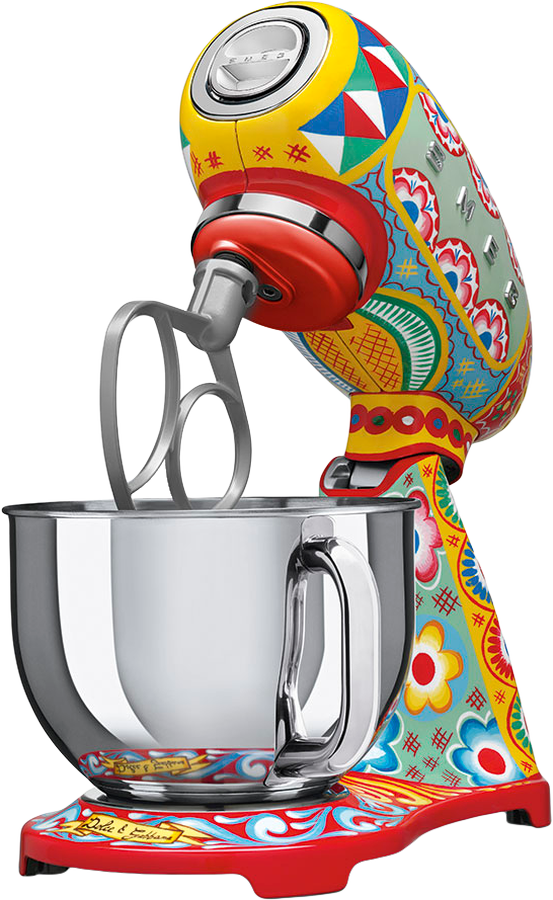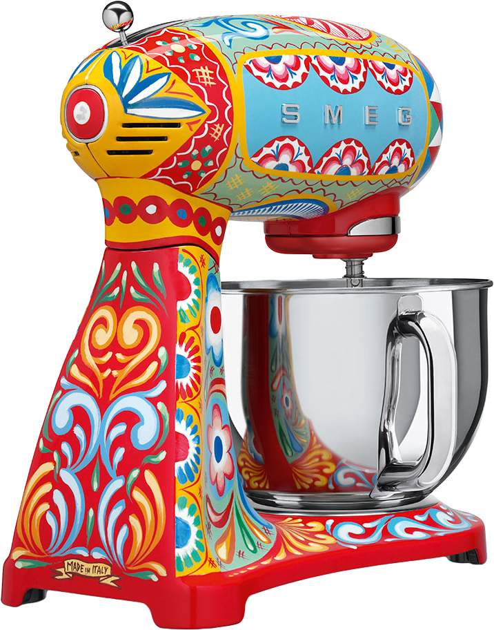 Одна из самых красивых моделей из ретро-серии выполнена в сотрудничестве со знаменитым дизайнерским дуэтом Dolce & Gabbana. Ее корпус, изготовленный из литого алюминия, покрыт яркими узорами. Вместительная чаша на 4,8 л сделана из полированной нержавеющей стали, так что прослужит долго и не будет оказывать влияния на вкус продуктов. Для шестеренок механизма использовали закаленную сталь, поэтому они не изнашивааются.