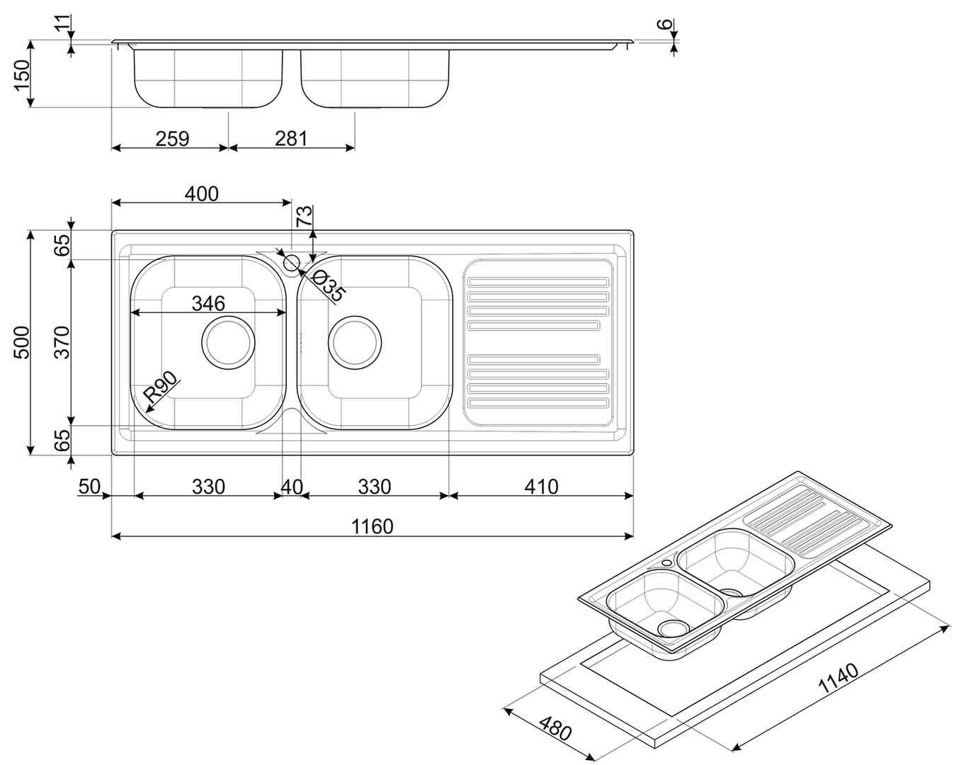 Пользователь может работать с 2 чашами размером 330*370 мм каждая. Их глубина составляет по 15 см, что дает возможность мыть в ней даже объемную посуду. В каждой из моек устанавливается специальный сифон с возможностью подключения посудомоечной или стиральной машины. Уникальный корзинчатый вентиль 3 1/2" позволяет легко управлять сливом и при необходимости его очищать от загрязнений. С правой стороны от чаш располагается специальное крыло внушительного размера, на котором можно разместить посуду или продукты.