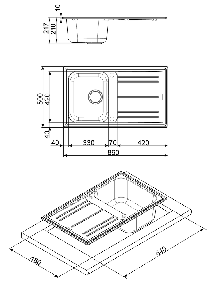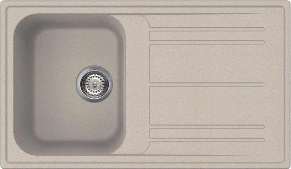 Материал мойки — качественный искусственный гранит. Он легче, чем натуральный камень, имеет абсолютно равномерную окраску, устойчив к царапинам и потертостям. Поскольку поверхность композита не имеет пор, ваша мойка не будет окрашиваться соком овощей, на ней не задержатся частицы пищи, а значит, и неприятного запаха удастся избежать. Еще одно достоинство моек из искусственного гранита — способность гасить шум. Вода будет течь тихо, а брызги не преодолеют высоту 21 см, и ваша столешница останется сухой. В комплект входит все необходимое для установки: сифон, зажимы, корзинчатый вентиль и уплотнительная лента.