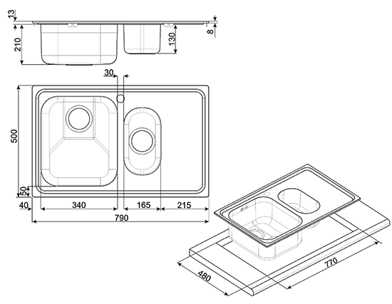 Предусмотрена врезная установка в столешницу, высота бортика равна 13 мм. Подробная схема встраивания дает пользователю возможность самостоятельно выполнить монтаж. Корзинчатый вентиль обеспечивает надежную защиту канализационных труб от засорения большими кусками пищевых отходов. С правой стороны изделия предусмотрена дополнительная рабочая поверхность. Крыло может использоваться для сушки посуды или хранения моющих средств. Практичная и стильная мойка станет отличным дополнением любой классической кухни.