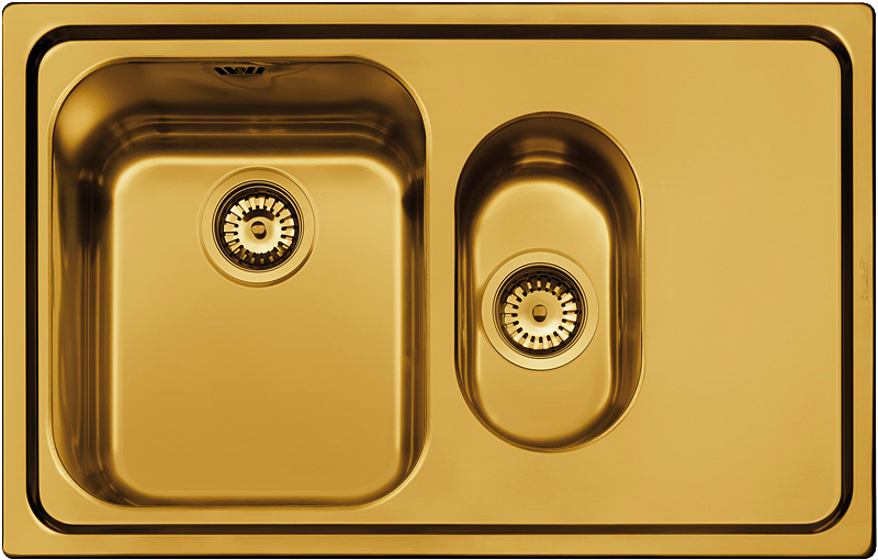 Кухонная мойка с 2 чашами отличается изысканным дизайном. Модель золотистого цвета из коллекции Cortina производится в Италии из нержавеющей стали толщиной 0,7 мм. Высококачественный металл не подвержен коррозии, уникальное PVD-покрытие сохраняет презентабельный вид изделия в течение всего срока эксплуатации. Две чаши глубиной 210 и 130 мм дают возможность одновременно решать разные бытовые задачи. К примеру, мыть посуду и размораживать продукты перед готовкой. Монтажные габариты изделия составляют (ВxШxГ): 223x790x500 мм. В комплект поставки входят: корзинчатый вентиль на 3 1/2 дюйма, сифон, уплотнитель и специальные фиксирующие зажимы.