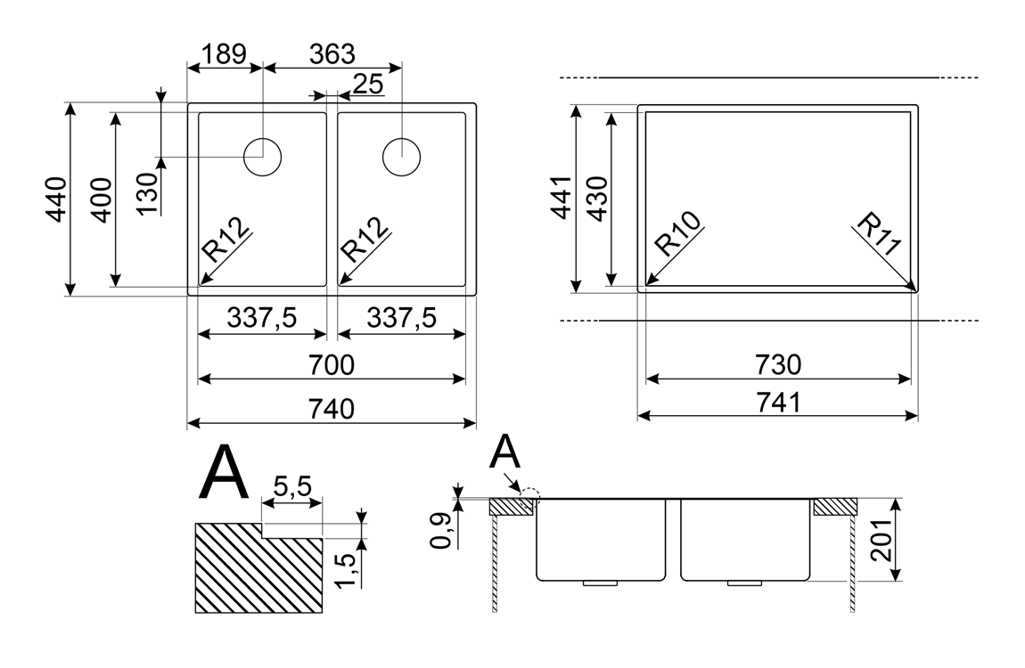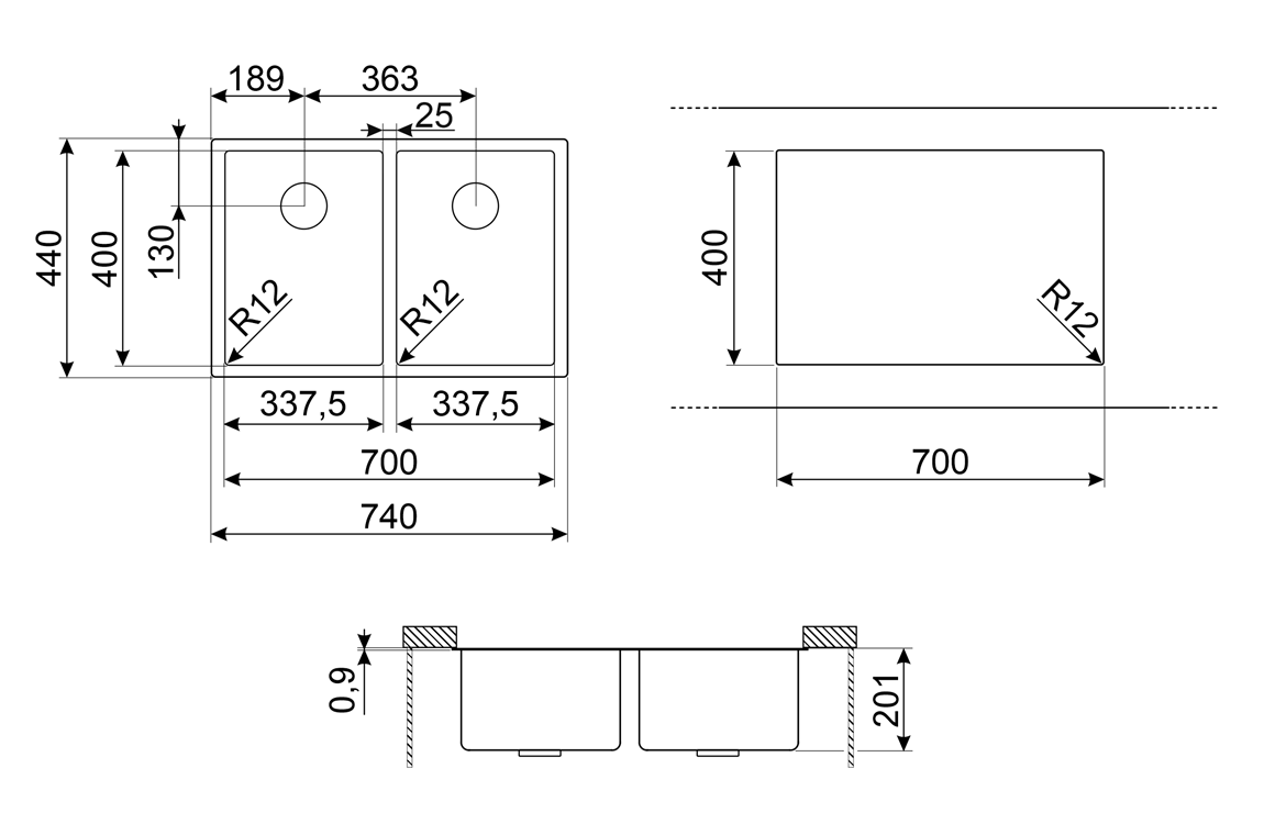 Необорачиваемая мойка может быть установлена вровень со столешницей или под столешницу, размеры выреза составляют 730x430 мм. Раковина фиксируется при помощи 10 стандартных зажимов, которые включены в комплектацию. Оригинальные аксессуары обеспечивают комфортный монтаж и эксплуатацию: корзинчатый вентиль, сифон с возможностью подключение посудомоечной или стиральной машины, фиксирующие зажимы, силикон, встроенный плоский сливной комплект. Диаметр сливного отверстия составляет 90 мм. Корзинчатый вентиль предотвращает засор канализационных труб пищевыми отходами.
