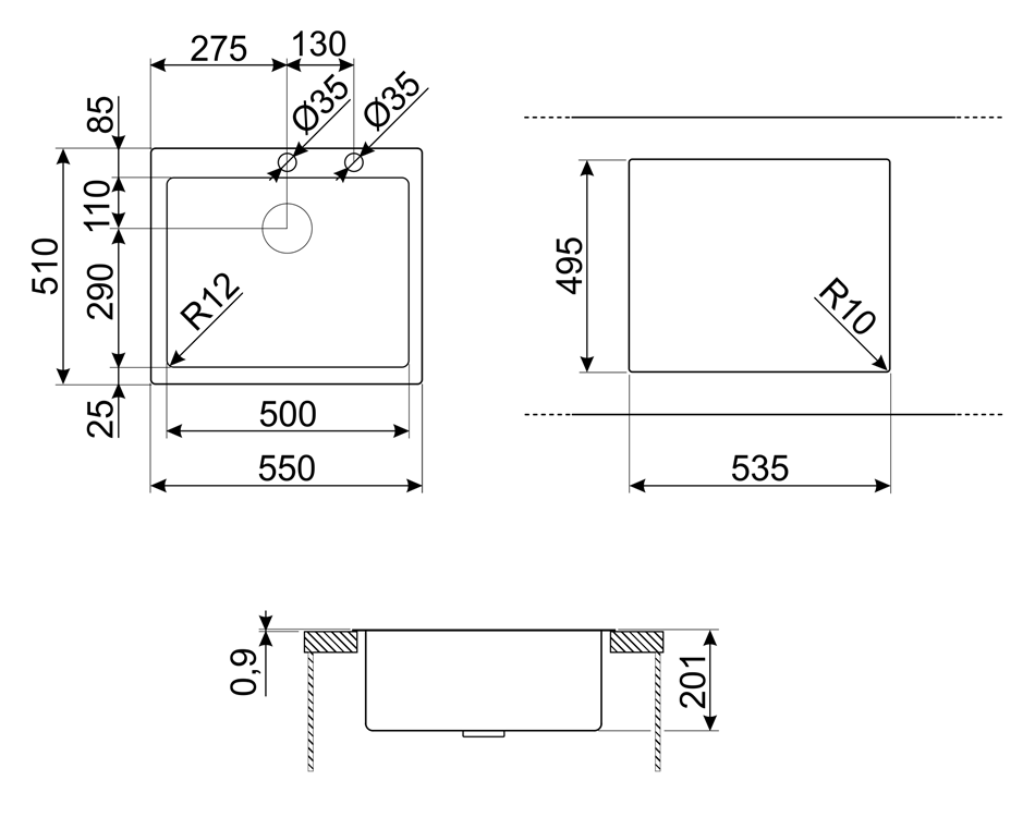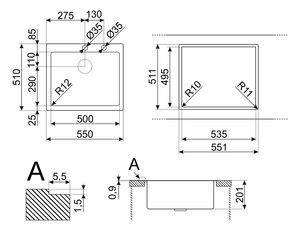 Модель предназначена для установки вровень со столешницей, размеры выреза составляют 535x495 мм. Такой монтаж очень удобен как с эстетической, так и с практической точки зрения. В комплектацию мойки включены все необходимые аксессуары для комфортной эксплуатации раковины: корзинчатый вентиль, сифон с опцией подключения посудомоечной машины, фиксирующие зажимы (10 штук), встроенный плоский сливной комплект. Сварная чаша прямоугольной формы дает возможность мыть крупную посуду, овощи и фрукты, набирать воду для хозяйственных нужд. Диаметр предварительно сформированного отверстия под смеситель равен 35 мм.