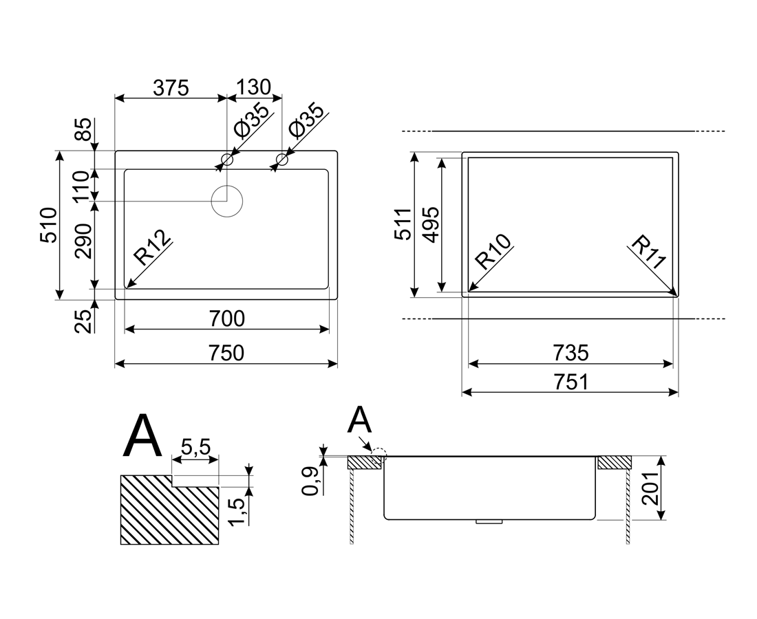 Размеры выреза в столешнице (мм) 735*495 мм