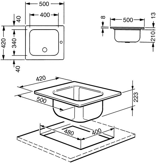 Необорачиваемая кухонная мойка устанавливается в столешницу с бортиком 8 мм, монтажные размеры изделия (ШxГxВ): 500x420x223 мм. Модель прямоугольной формы производится в Италии из высококачественной матовой нержавеющей стали толщиной 0.7 мм. Раковина оборудована вместительной чашей (400x340 мм) глубиной 210 мм, что обеспечивает удобную эксплуатацию. Большая полезная площадь чаши дает возможность использовать крупногабаритную и нестандартную кухонную утварь в процессе приготовления блюд.