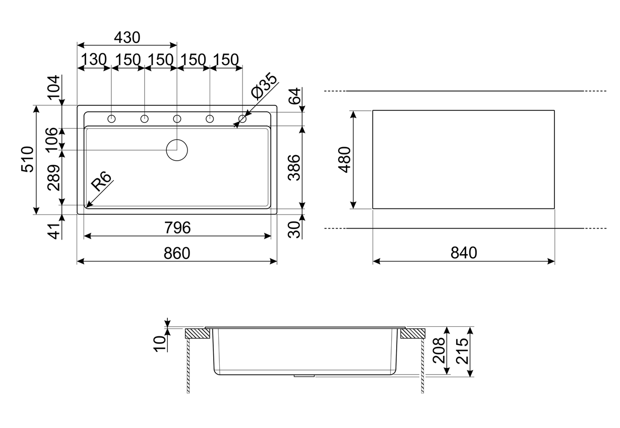 Размеры выреза в столешнице 840 x 480 мм