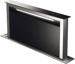 Следующим шагом на пути уменьшения габаритов стала выдвижная вытяжка для кухни. Ее легко узнать по выдвигающемуся экрану, захватывающему поток воздуха от плиты. В сложенном виде модель может занимать немного места, что является несомненным преимуществом в маленьких кухнях. Выдвижные вытяжки способны встраиваться не только в навесной шкафчик над плитой, но и в стол. В этом случае экран выезжает снизу, а мотор и фильтры располагаются под столешницей.