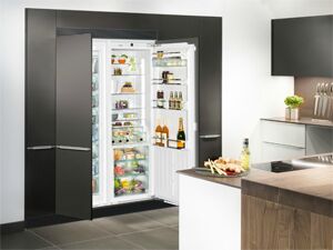 Такие модели холодильников предназначены для размещения в специально отведенной нише кухонного гарнитура, при этом лицевая панель остается открытой. Внешне кажется, что это обычный отдельностоящий холодильник, установленный в нишу, однако это не так. Встраиваемые модели имеют свои определённые конструктивные особенности, позволяющие устройству функционировать в замкнутом пространстве гарнитура без перегревов и других негативных факторов, приводящих к возникновению неисправностей. Различия в конструкции в первую очередь определены особой системой вентиляции, а также наличием различных решений, направленных на снижение уровня шума и вибраций в процессе работы. Кроме того, предусмотрена система дополнительной циркуляции воздуха, решетки которой находятся в нижней части холодильника.