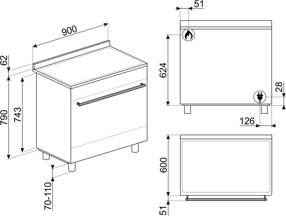 Корпус оснащается массивной варочной панелью с 5 газовыми конфорками, большой внутренней камерой на 115 литров, а также просторным отсеком для хранения комплектации, который выдвигается благодаря системе Push-Pull. Варочная зона из нержавеющей стали дополнена черными чугунными решетками, на которые устанавливается посуда. Поворотные переключатели позволяют не только регулировать мощность конфорок, но и автоматически зажигать пламя. Внутренняя камера покрывается эмалью легкой очистки и оснащается 5 уровнями приготовления. Пользователь может не только включать режимы и регулировать температуру, но и активировать дополнительное освещение.