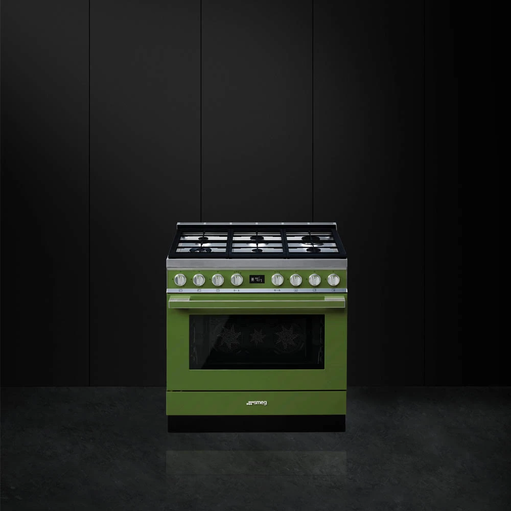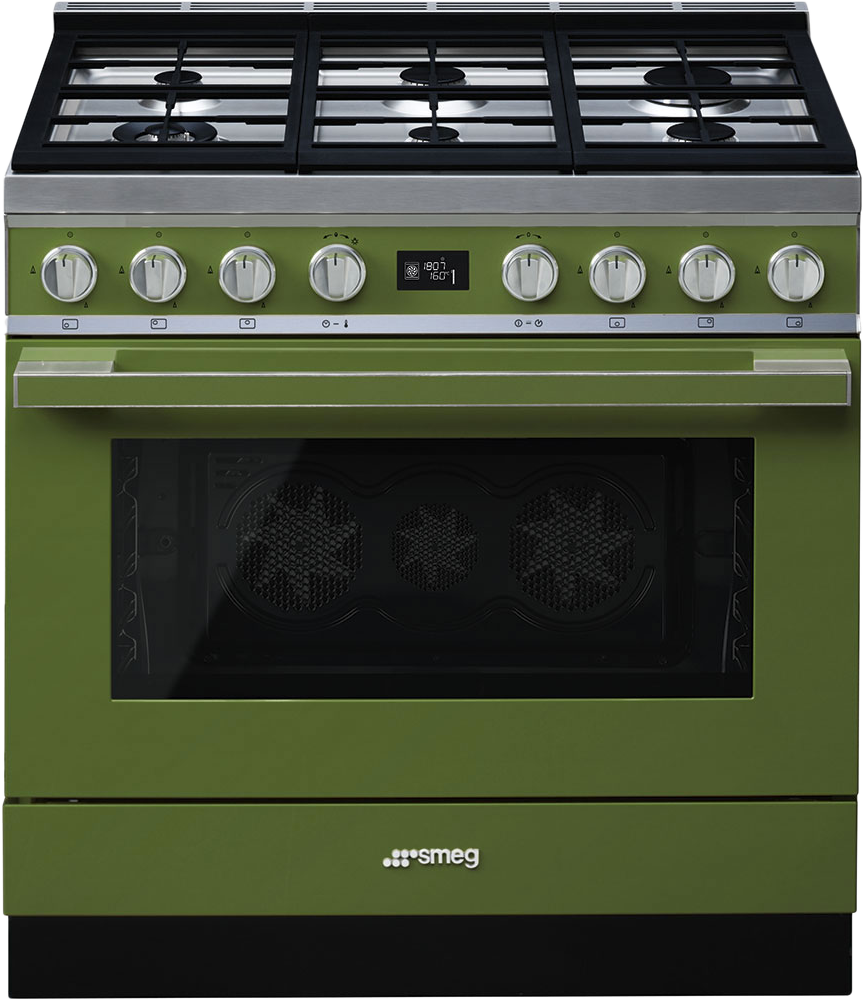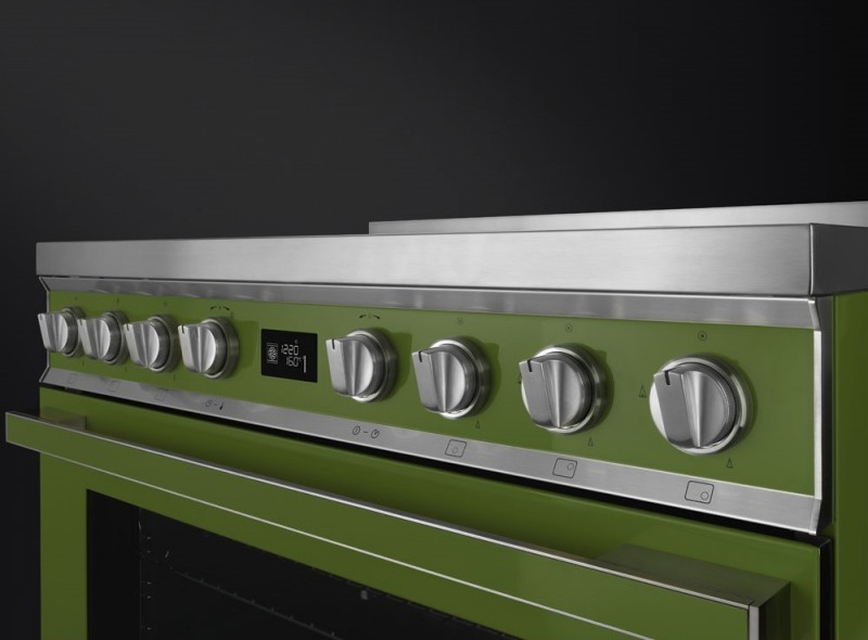 Если бы вы не знали, что эта модель принадлежит к серии Portofino, об этом можно было бы догадаться при одном взгляде на фото. Красивый оттенок зеленого цвета, в который окрашен варочный центр, идеально подходит для кухни, поскольку создает ощущение свежести. Модель состоит из трех разных по назначению частей: сверху — газовая варочная панель, ниже — огромная 115-литровая духовка, а под ней — отсек для хранения с механизмом Push-pull.