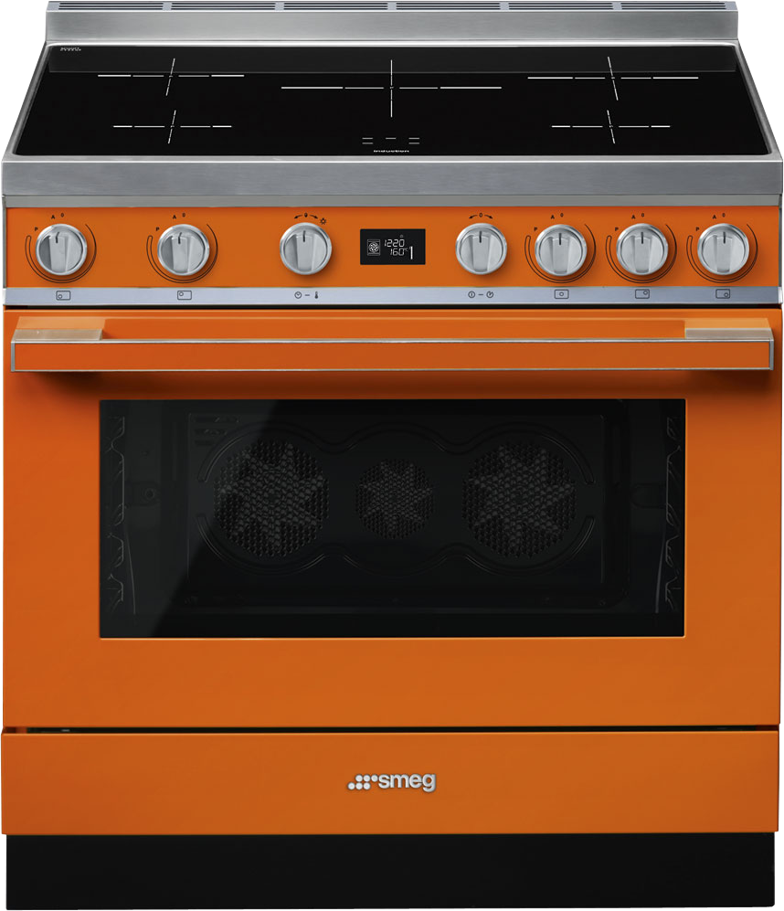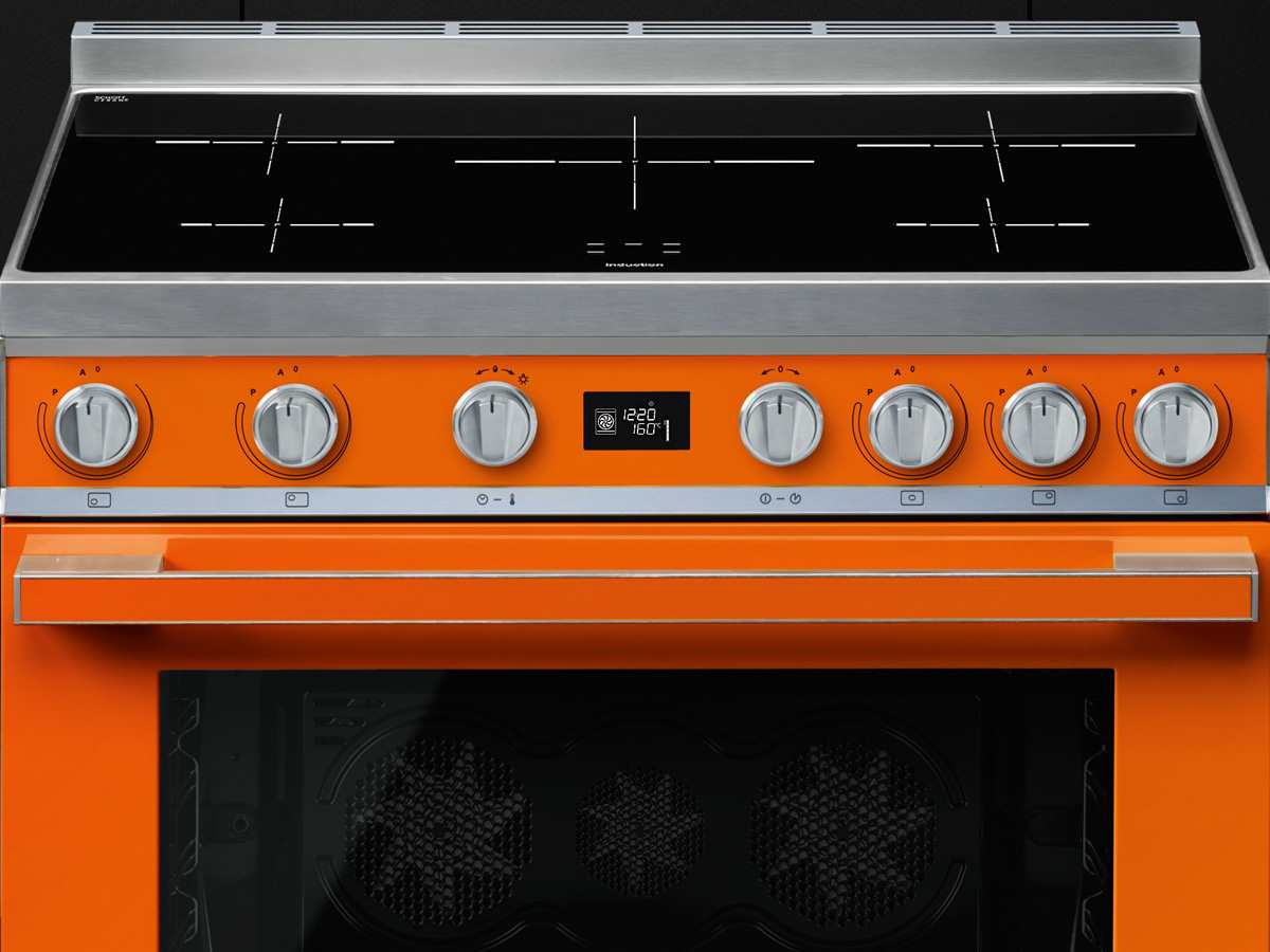 Жизнерадостная модель оранжевого цвета с рабочим столом из черной стеклокерамики смотрится очень нарядно. Она относится к популярной серии Portofino и обладает всеми преимуществами современной техники. Ее пять индукционных зон способны самостоятельно определять диаметр посуды, что способствует экономии электроэнергии. Функция Бустер позволяет конфоркам временно заимствовать мощность у соседней зоны нагрева, а автоматическое отключение при перегреве избавляет от пригорания блюд и порчи самой плиты. Чтобы вы не обожглись, конструкторы наделили плиту индикацией остаточного тепла, а на дверцу установили целых четыре стекла.