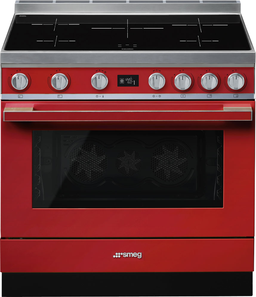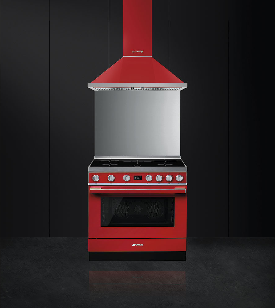 Уникальная модель кухонной плиты от итальянской торговой марки SMEG выполнена из окрашенного в красный цвет металла. Модель из дизайнерской коллекции Portofino может устанавливаться в кухни со средиземноморским интерьером. В рамках данной коллекции также представлены подходящие кухонные вытяжки. Ширина варочного центра составляет 90 см, что позволяет реализовать как большую зону приготовления блюд, так и большой духовой шкаф. Рабочая зона изготавливается из качественной стеклокерамики черного цвета, которая может выдерживать высокую температуру. Для управления работой 5 индукционных конфорок владелец может применять поворотные переключатели Portofino. Каждая из конфорок может временно увеличивать свою мощность (например, с 2,6 до 3,7 кВт) при активации функции Booster.