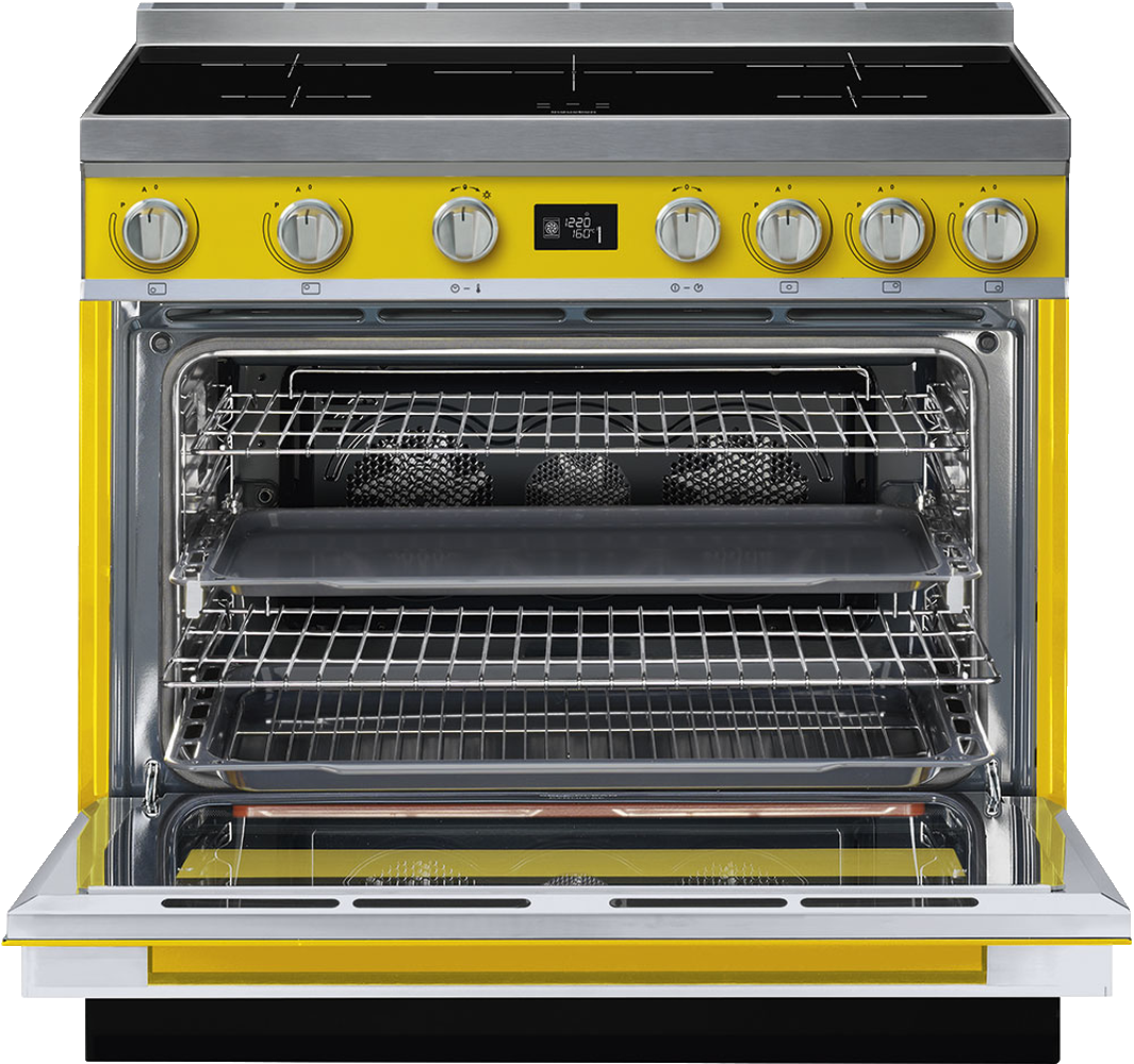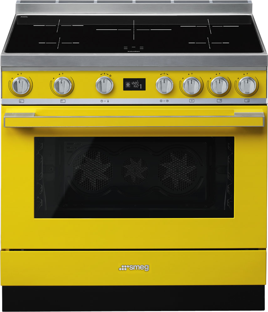 Солнечно-желтая плита с черной стеклокерамической панелью выглядит очень нарядно. Фирменный дизайн серии Portofino проявляется в каждой детали: удобных поворотных переключателях, эргономичной ручке духовки, изящном логотипе на выдвижном ящике. Габариты модели — 92х90х60 см, снизу находится ящик для хранения кухонной утвари. Сверху располагается индукционная варочная панель с пятью зонами нагрева. Ее набор функций можно назвать традиционным: Booster, автоопределение посуды, автоматическое отключение при перегреве.
