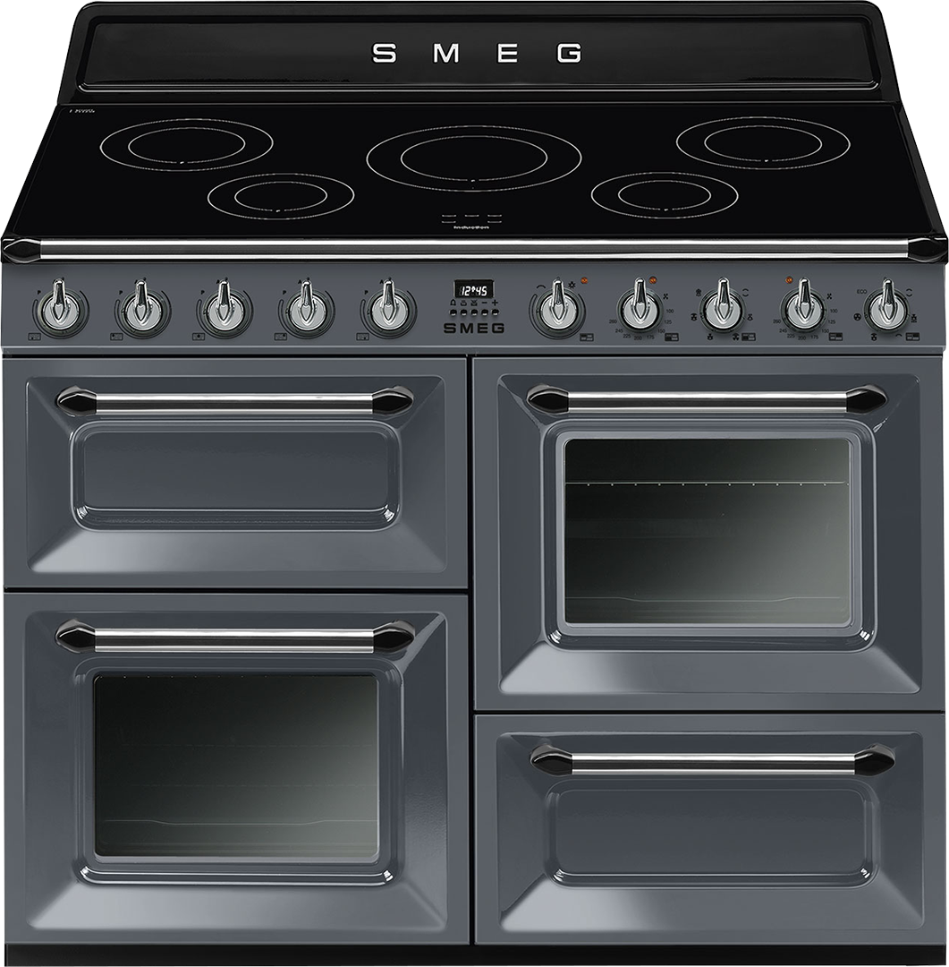 Габариты составляют: 110*90*60 см. Модель оснащается индукционной варочной панелью, а также 3 духовыми шкафами и выдвижным ящиком для принадлежностей. Для управления работой бытовой техники применяются 10 поворотных переключателей из нержавеющей стали. Также на панели размещается яркий цифровой дисплей и ряд кнопок.