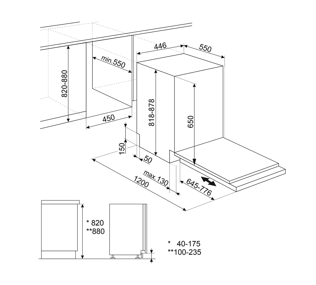 Мин. и максимальная высота цоколя: 40 - 175 мм