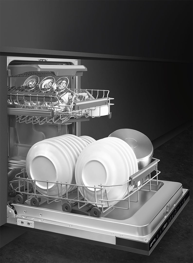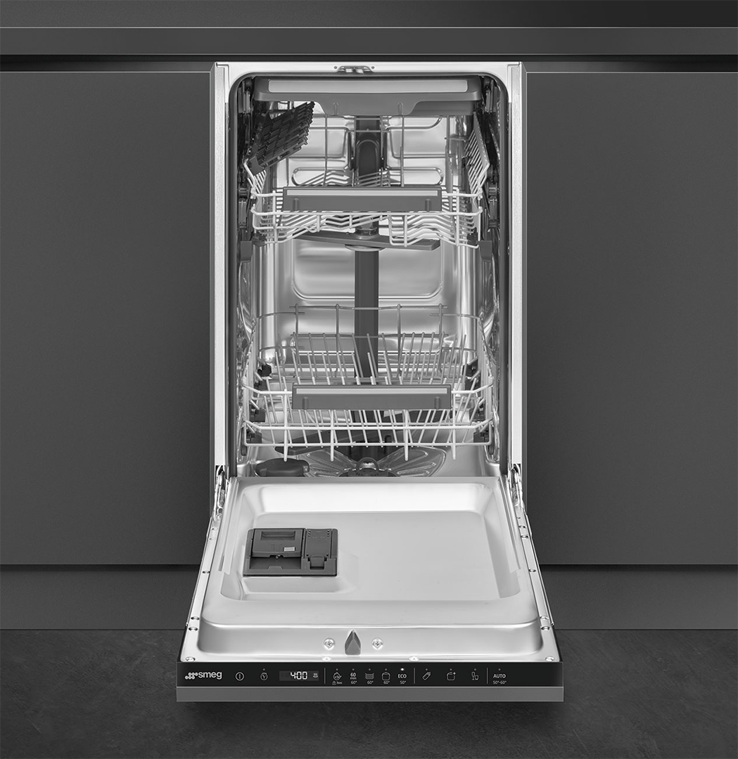 Функциональная посудомоечная машина от итальянского бренда SMEG изготавливается из качественных комплектующих с применением современных технологических решений. Устройство - встраиваемое, компактное. Его ширина составляет 44,6 см, что позволяет размещать модель в небольшую кухню. На передней части дверцы FlexiFit располагаются специальные петли, на которые можно установить фасадную панель. Это позволяет инсталлировать посудомоечную машину в нейтральный, современный или классический интерьер. Устройство можно подключать к горячей воде, что может обеспечить экономию электроэнергии до 35%.