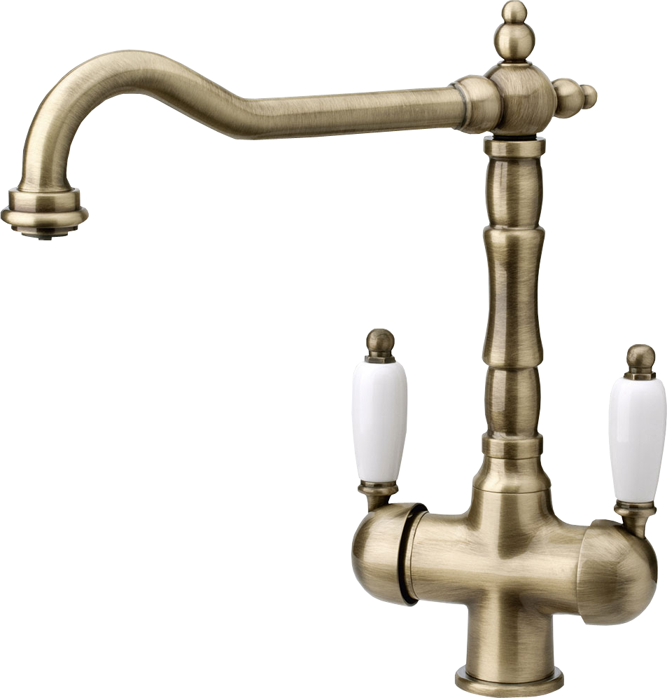 Этот невероятно красивый смеситель высотой 22,5 см имеет существенное отличие от других моделей. Его преимущество не только в том, что излив, корпус и рычаг покрыты красивым латунным покрытием. И даже не в наличии аэратора, который отвечает за подмешивание к струе воздушных пузырьков. Эта модель обращает на себя внимание конструкцией: у нее два рычага вместо одного.