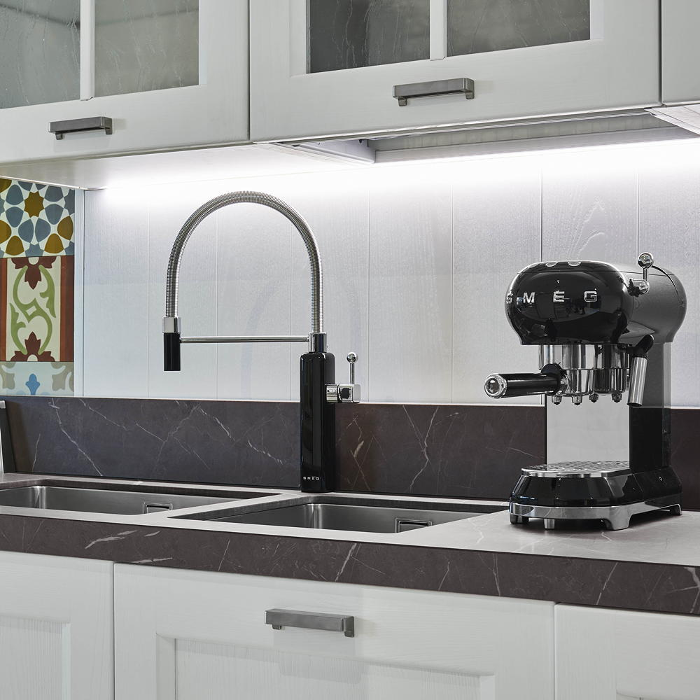 Регулировать напор и температуру воды очень удобно при помощи рычага. Модель оснащена выдвижным изливом, который обеспечивает комфортную эксплуатацию, позволяя решать различные бытовые задачи. Инновационные функции ESC и WSC помогают оптимально расходовать как горячую, так и холодную воду. Этот смеситель будет гармонично смотреться вместе с мойкой SMEG из искусственного гранита. За изделием очень просто ухаживать, покрытие не выцветает и не покрывается царапинами с течением времени.
