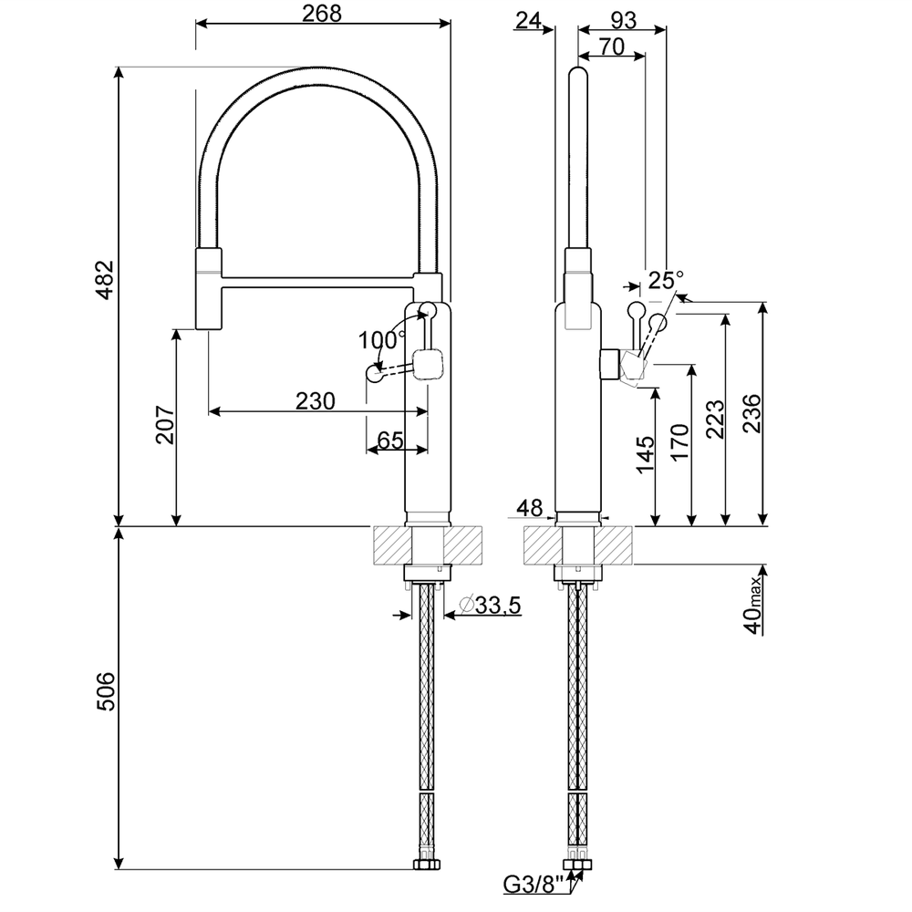 Этот однорычажный смеситель выгодно отличается от других моделей запоминающимся дизайном. Блестящее хромированное покрытие выглядит очень стильно, а боковой рычаг необычной формы такой же, как у современной малой бытовой техники Smeg, так что вам будет легко подчеркнуть гармонию кухонного интерьера. Высота модели — 482 см, так что набирать высокие вазы, трехлитровые банки или 7-литровые кастрюли наконец-то станет удобно.
