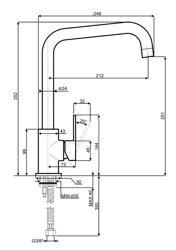 Этот смеситель классической формы достаточно высок — 352 мм, а потому его обычно выбирают для глубоких моек. Гармоничные пропорции излива (248 мм в длину и 251 мм в высоту) обеспечивают превосходное обслуживание раковины: струю легко направить прямо в центр слива, а при поворотах вы легко сможете смыть со стен пену или частицы пищи.