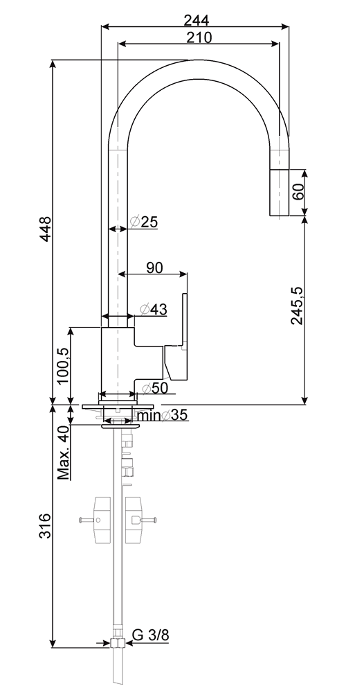 Эта модель идеально подходит для больших кухонь. Ее высота — 448 мм, так что мойка должна быть достаточно глубокой, чтобы избежать образования брызг. Однако у высокого поворотного излива немало преимуществ: можно легко мыть противни, наполнять водой высокие кастрюли и вазы. Падающая с высоты струя великолепно промывает зелень или мелкие ягоды.